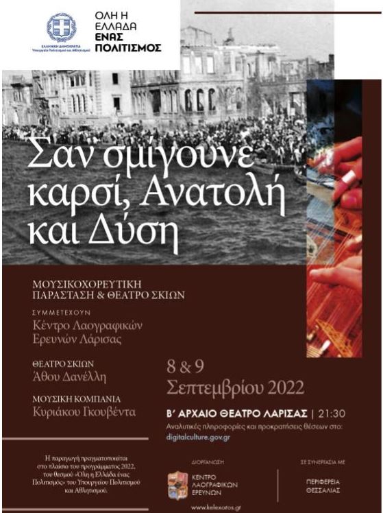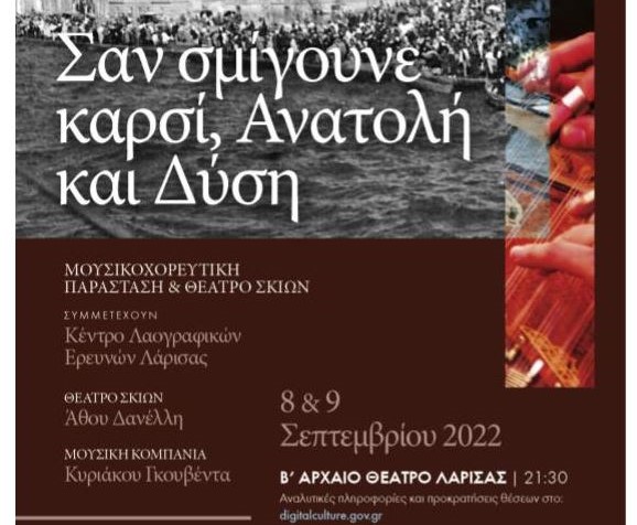 Στις 8 & 9 Σεπτεμβρίου θα πραγματοποιηθεί στο Β΄ αρχαίο θέατρο η παράσταση “Σαν σμίγουνε καρσί, Ανατολή και Δύση”, μια συμπαραγωγή του ΥΠΠΟΑ και του Κέντρου Λαογραφικών Ερευνών Λάρισας, με την υποστήριξη της Περιφέρειας Θεσσαλίας.