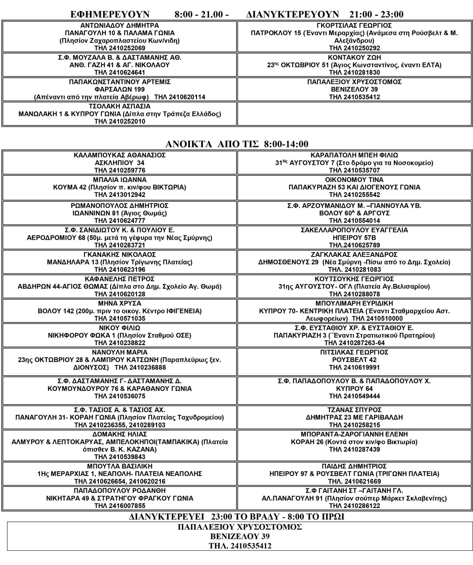 ΚΥΡΙΑΚΗ 29/10/2023 ΕΦΗΜΕΡΕΥΟΥΝ 8:00 – 21.00 ΚΑΛΜΠΟΚΙΝΗΣ ΑΝΑΣΤΑΣΙΟΣ 23ης ΟΚΤΩΒΡΙΟΥ 24-26 (Παραπλεύρως Ξεν. Διόνυσος) ΤΗΛ 2410288488…
