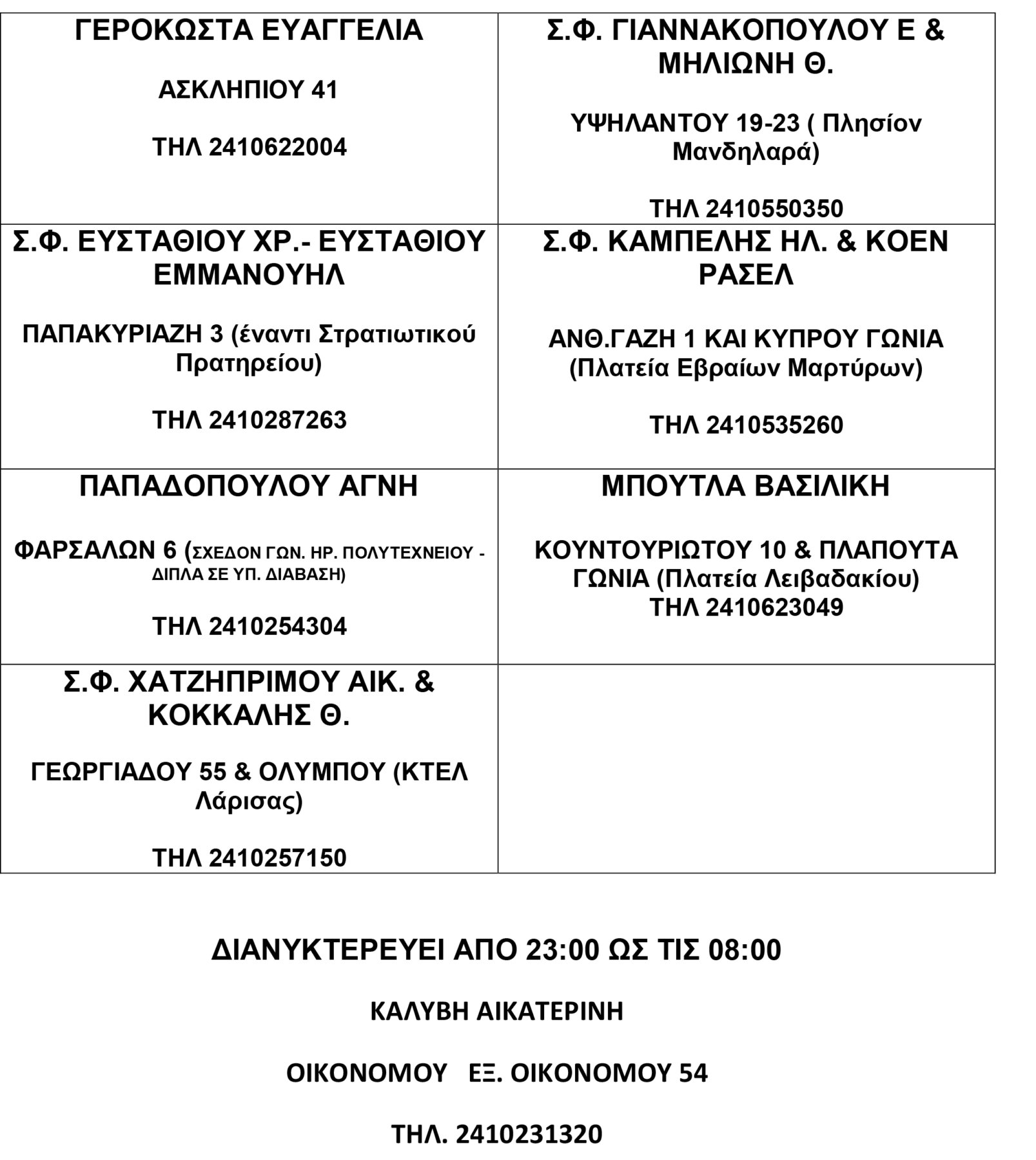 ΚΥΡΙΑΚΗ 29/10/2023 ΕΦΗΜΕΡΕΥΟΥΝ 8:00 – 21.00 ΚΑΛΜΠΟΚΙΝΗΣ ΑΝΑΣΤΑΣΙΟΣ 23ης ΟΚΤΩΒΡΙΟΥ 24-26 (Παραπλεύρως Ξεν. Διόνυσος) ΤΗΛ 2410288488…