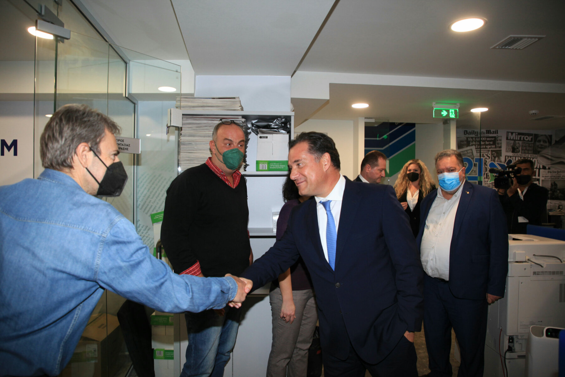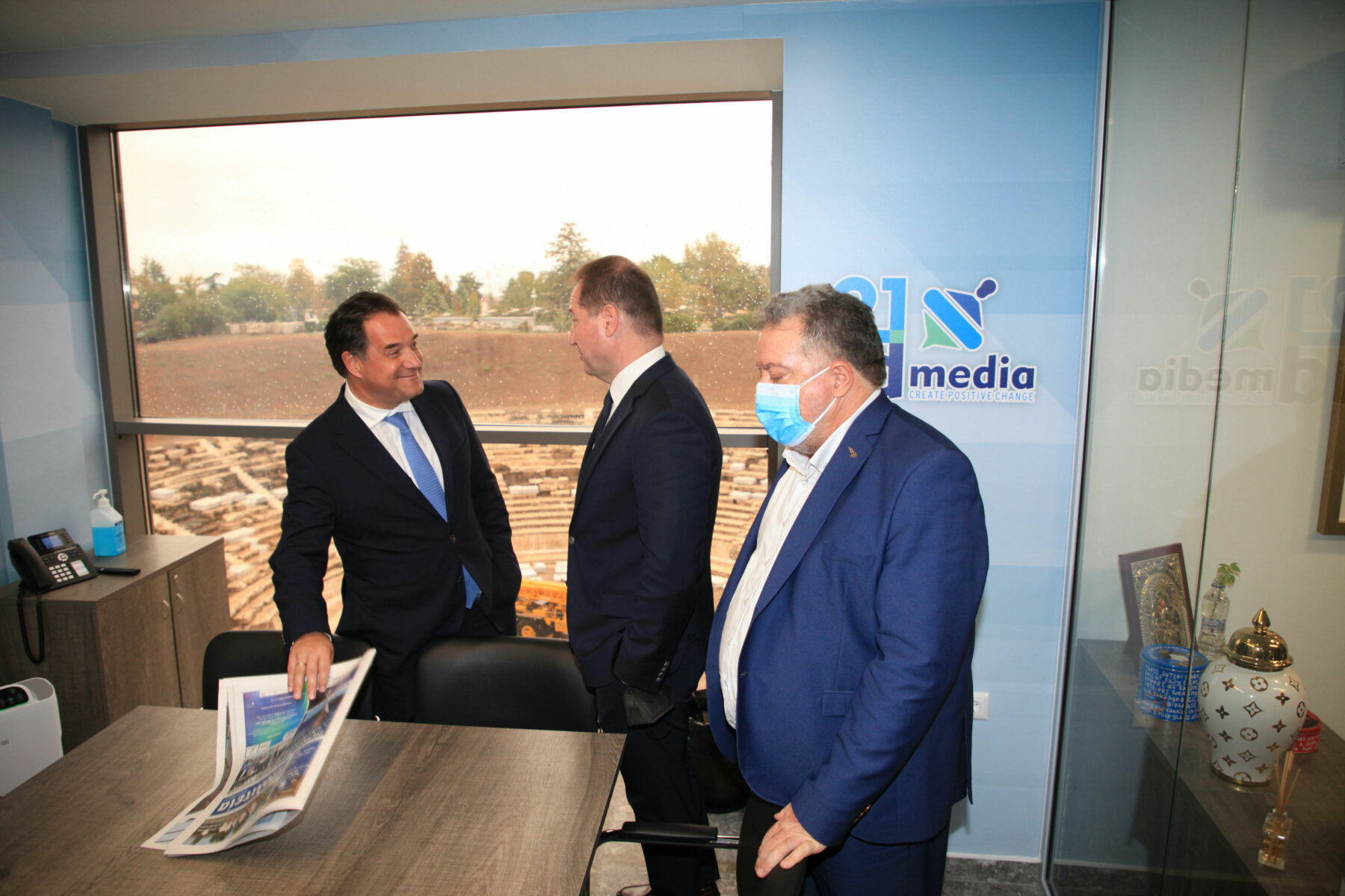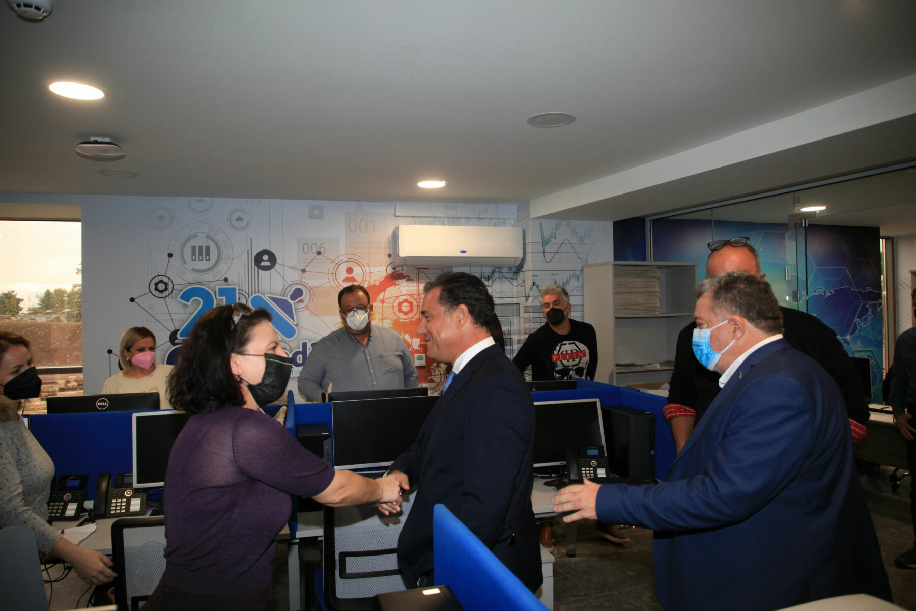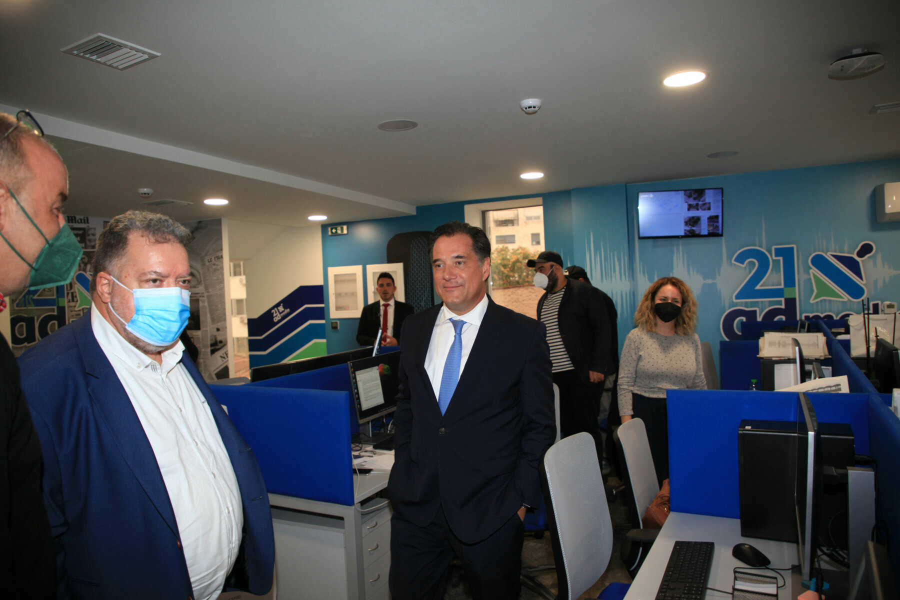 Στις κτιριακές εγκαταστάσεις της “21 admedia” ξεναγήθηκε ο υπουργός Ανάπτυξης και Επενδύσεων κ. Άδωνις Γεωργιάδης από τον πρόεδρο και τον αντιπρόεδρο του Δημοσιογραφικού Οργανισμού, Αχιλλέα και Γιάννη Νταβέλη. Ο υπουργός χαιρέτισε και συνομίλησε με τους δημοσιογράφους και τους τεχνικούς της “21 admedia”.