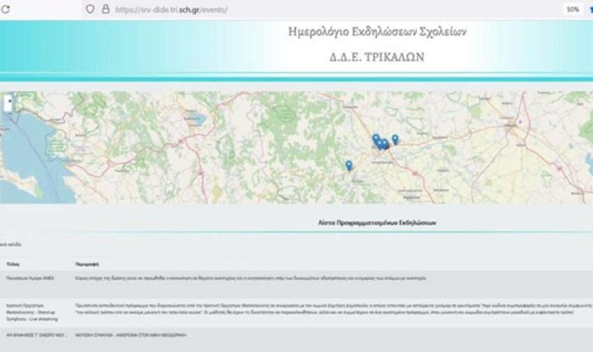 Κάθε ανάρτηση εκδήλωσης ή δράσης των σχολικών μονάδων καταγράφεται σε μια λίστα, η οποία εφόσον επιλεχθεί ανοίγει με τα δεδομένα της και ταυτόχρονα καταγράφεται οπτικά σε ειδικό χάρτη (google maps) με τη μέθοδο του mapping. Επιπρόσθετα υπάρχει αρχείο εκδηλώσεων. Έτσι οι γονείς, οι εκπαιδευτικοί, οι δημοσιογράφοι και οι πολίτες μπορούν ανά πάσα στιγμή να ενημερωθούν για εκδηλώσεις και δράσεις που γίνονται στα σχολεία της Δευτεροβάθμιας Εκπαίδευσης, σε όλη την Περιφερειακή Ενότητα Τρικάλων.