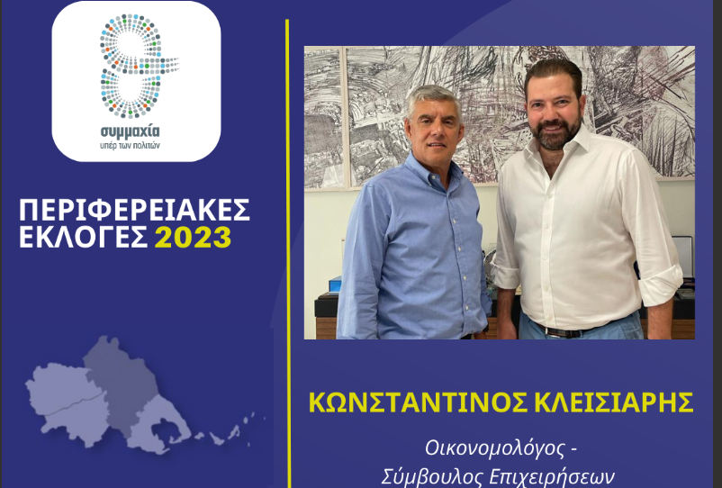Τον Οικονομολόγο – Σύμβουλο Επιχειρήσεων Κωνσταντίνο Κλεισιάρη που κατέρχεται υποψήφιος περιφερειακός σύμβουλος στην Π.Ε. Λάρισας στις αυτοδιοικητικές εκλογές του Οκτωβρίου, καλωσόρισε ο Περιφερειάρχης Θεσσαλίας Κώστας Αγοραστός στον συνδυασμό «Συμμαχία υπέρ των πολιτών» που έχει σταθερά στο επίκεντρο τον άνθρωπο και αγωνίζεται με έργα, δράσεις, πρωτοβουλίες για μια Περιφέρεια χωρίς διακρίσεις και αποκλεισμούς.