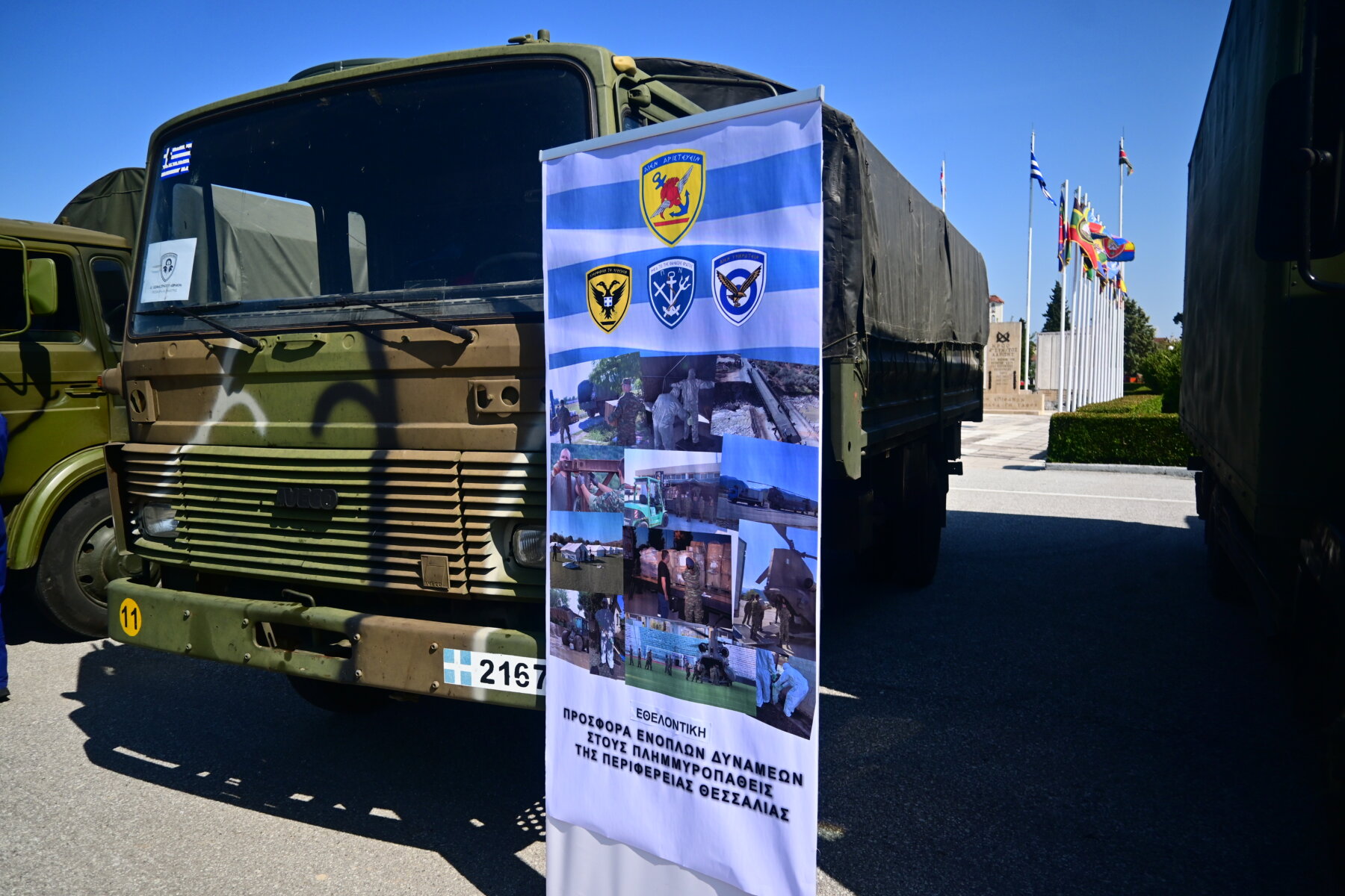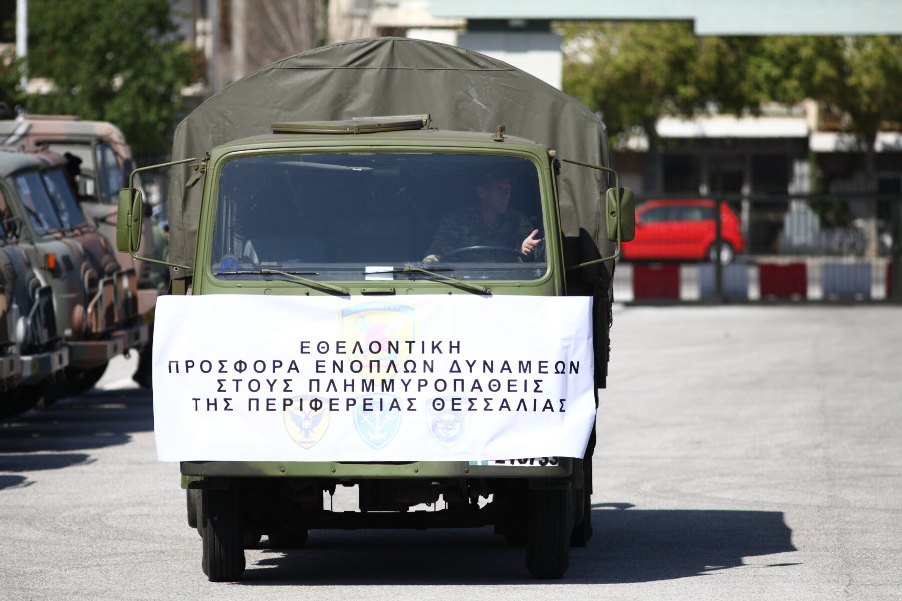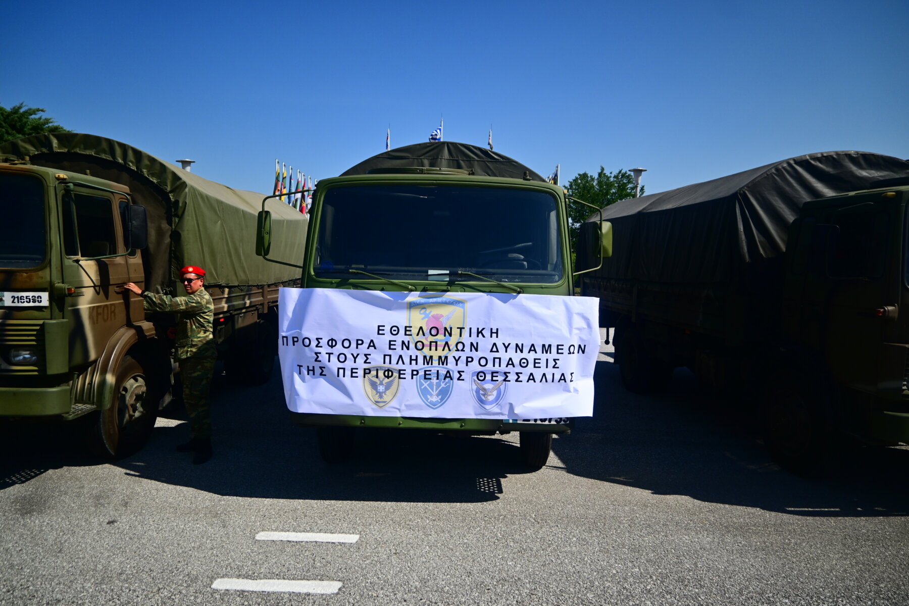 Κατέφθασε σήμερα το μεσημέρι κλιμάκιο των Ενόπλων Δυνάμεων, αποτελούμενο από 38 φορτηγά, στην 1η Στρατιά Λάρισας με προσφορά προς στους πλημμυροπαθείς της Θεσσαλίας.