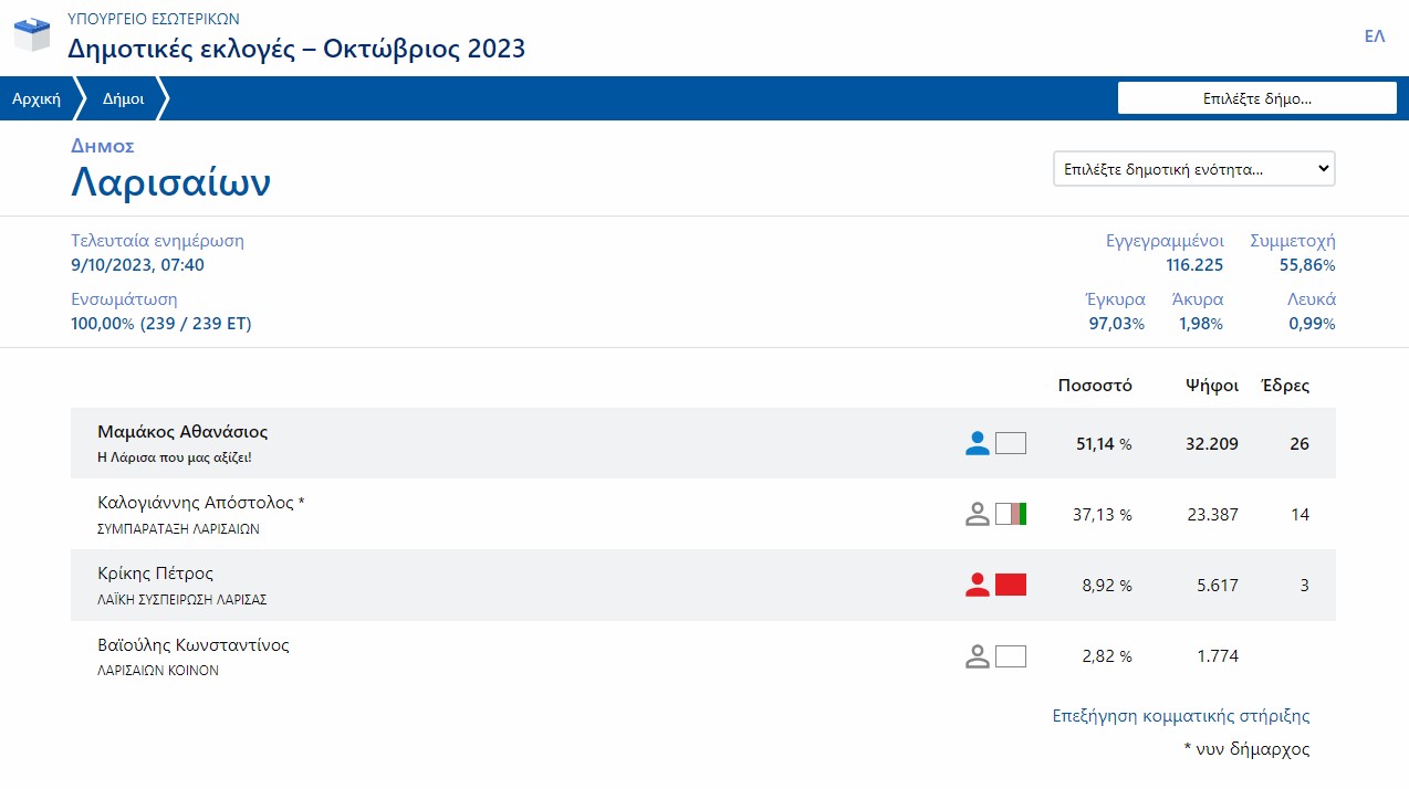 Αυτή είναι η κατανομή των σταυρών προτίμησης στην πόλη της Λάρισας για τους υποψήφιους δημοτικούς συμβούλους, όπως διαμορφώνεται το πρωί της Δευτέρας 9 Οκτωβρίου, σύμφωνα με το Υπουργείο Εσωτερικών.