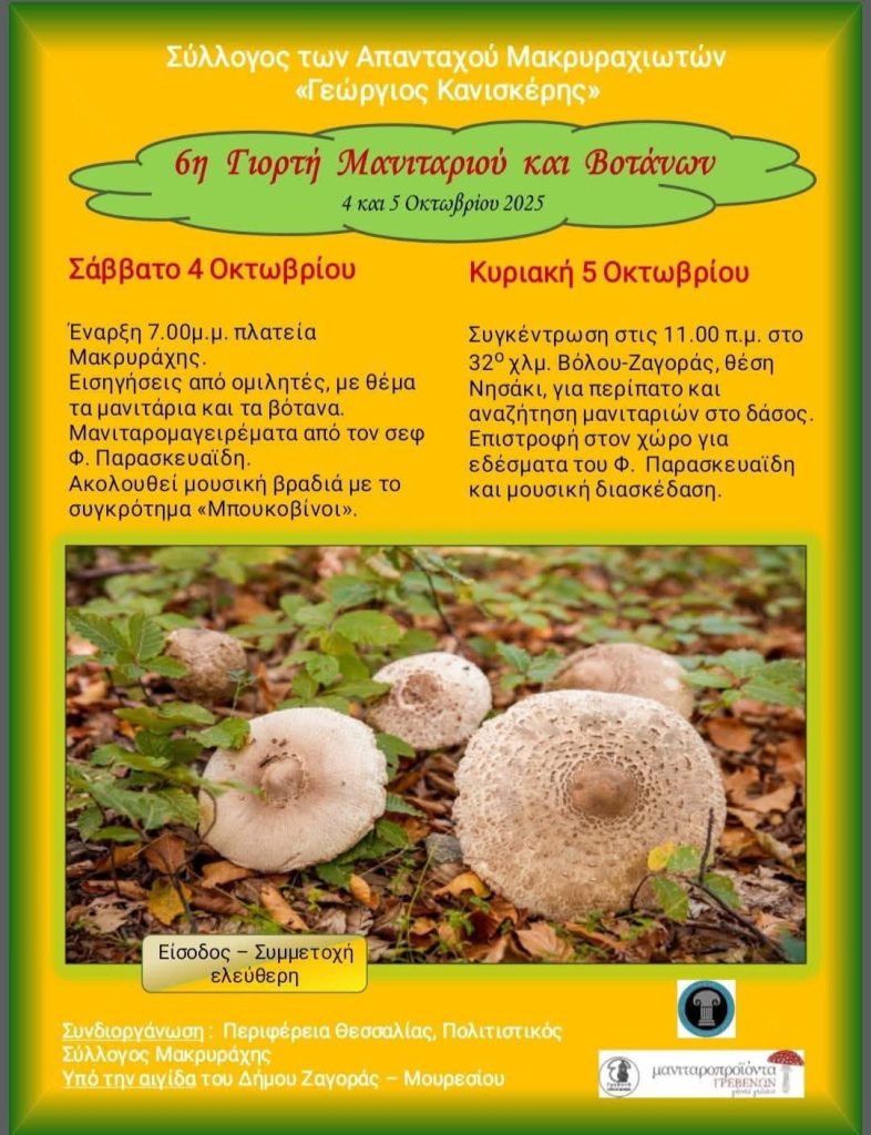 Ο Σύλλογος των Απανταχού Μακρυραχιωτών «Γεώργιος Κανισκέρης» διοργανώνει στις 4 και 5 Οκτωβρίου 2025 την 6η Γιορτή Μανιταριού και Βοτάνων, ένα διήμερο αφιερωμένο στη φύση, τη γαστρονομία και τη μουσική παράδοση.
