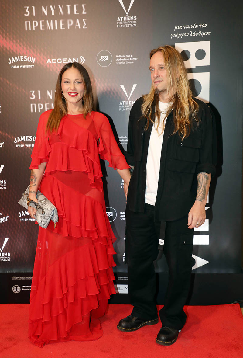 Η Πηνελόπη Αναστασοπούλου για την περίσταση επέλεξε ένα κατακόκκινο μάξι φόρεμα που της πήγαινε πολύ και το συνδύασε με τσάντα φάκελο που είχε snake print που φέτος έχει επιστρέψει στη μόδα. Από την άλλη ο γνωστός μουσικός και σύζυγος της ηθοποιού επέλεξε να φορέσει ένα total black σύνολο και λευκό T-shirt από μέσα.