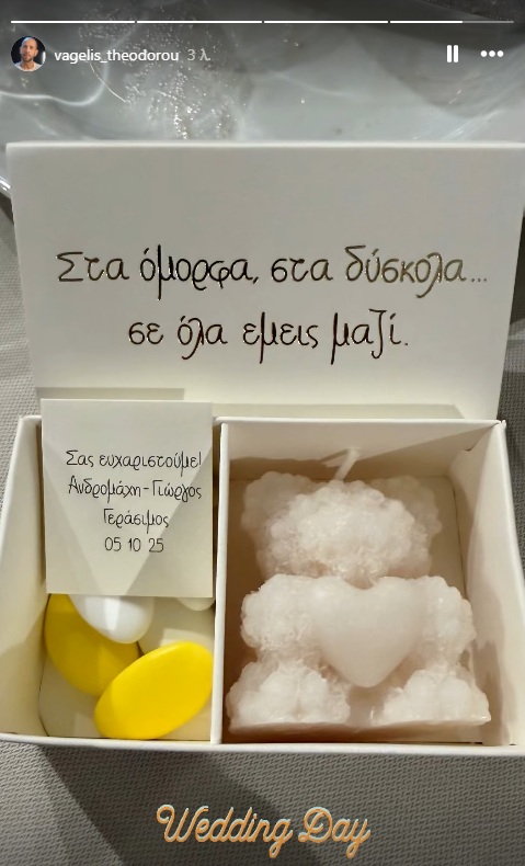 Η μπομπονιέρα είναι ένα κουτί με χρυσοτυπία που γράφει: «στα όμορφα, στα δύσκολα, σε όλα εμείς μαζί», έναν στίχο από το υπερεπιτυχημένο ντουέτο «Δε Μας Χωρίζει Τίποτα» της Ανδρομάχης και του Γιώργου Λιβάνη και περιέχει τα κουφέτα κι ένα αρωματικό κερί.