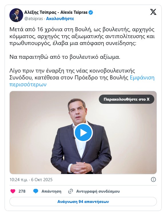 «Μετά από 16 χρόνια στη Βουλή, ως βουλευτής, αρχηγός κόμματος, αρχηγός της αξιωματικής αντιπολίτευσης και πρωθυπουργός, έλαβα μια απόφαση συνείδησης: