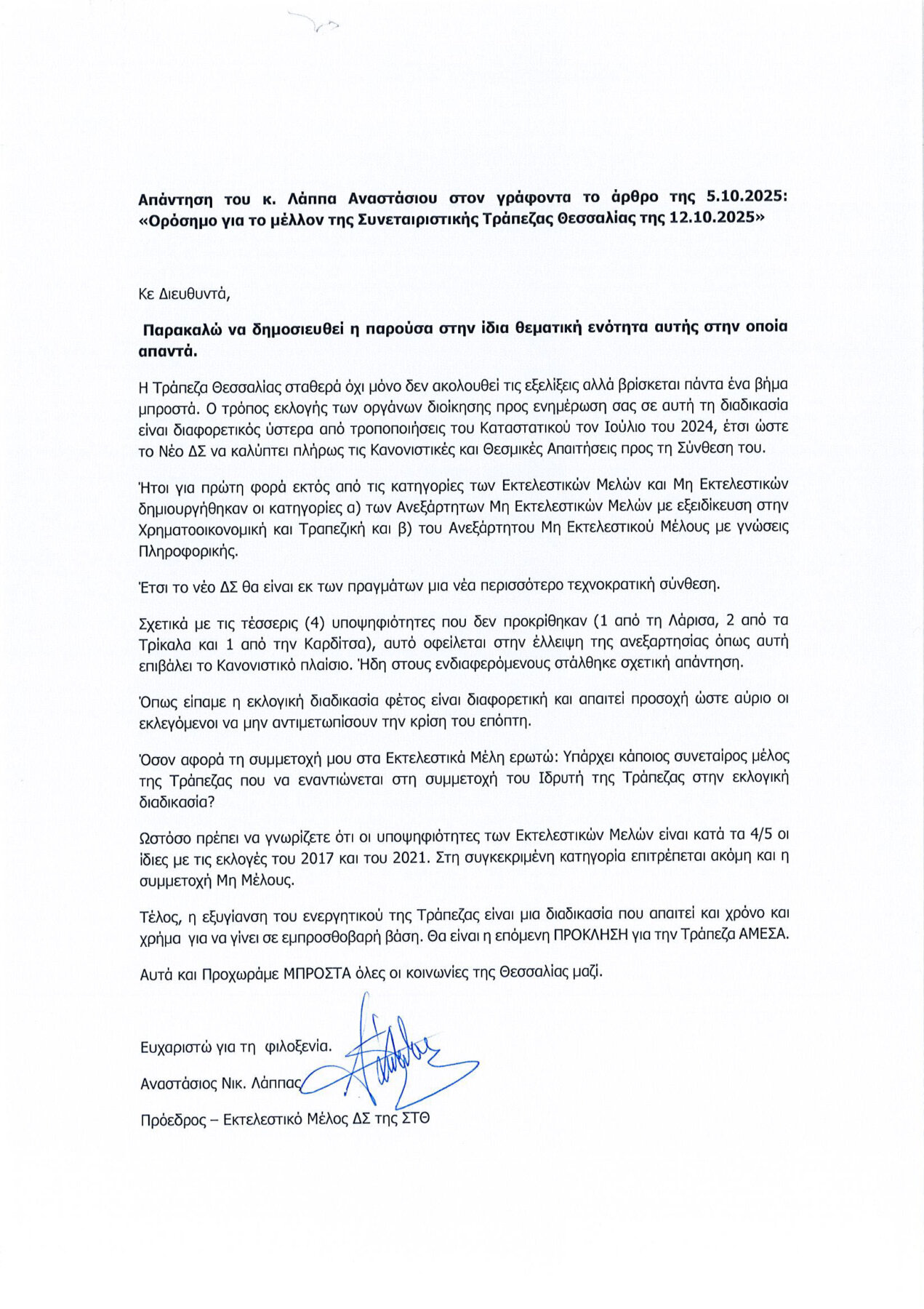 Ακολουθεί η απάντηση του κ. Αναστάσιου Νικ. Λάππα, Προέδρου και Εκτελεστικού Μέλους του Δ.Σ. της Συνεταιριστικής Τράπεζας Θεσσαλίας, σχετικά με το δημοσίευμα του FORMedia.gr της 5ης Οκτωβρίου 2025, με τίτλο «Ορόσημο για το μέλλον της Συνεταιριστικής Τράπεζας Θεσσαλίας – οι εκλογές της 12ης Οκτωβρίου».