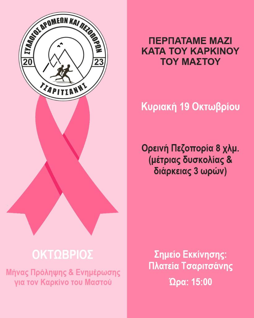 Ο Σύλλογος Δρομέων και Πεζοπόρων Τσαριτσάνης σε συνεργασία με τον Σύλλογο Καρκινοπαθών Λάρισας, θα πραγματοποιήσει Ορεινή Πεζοπορία 8 χλμ. τη Κυριακή 19 Οκτωβρίου, στο πλαίσιο ευαισθητοποίησης για τον Καρκίνο του Μαστού.
