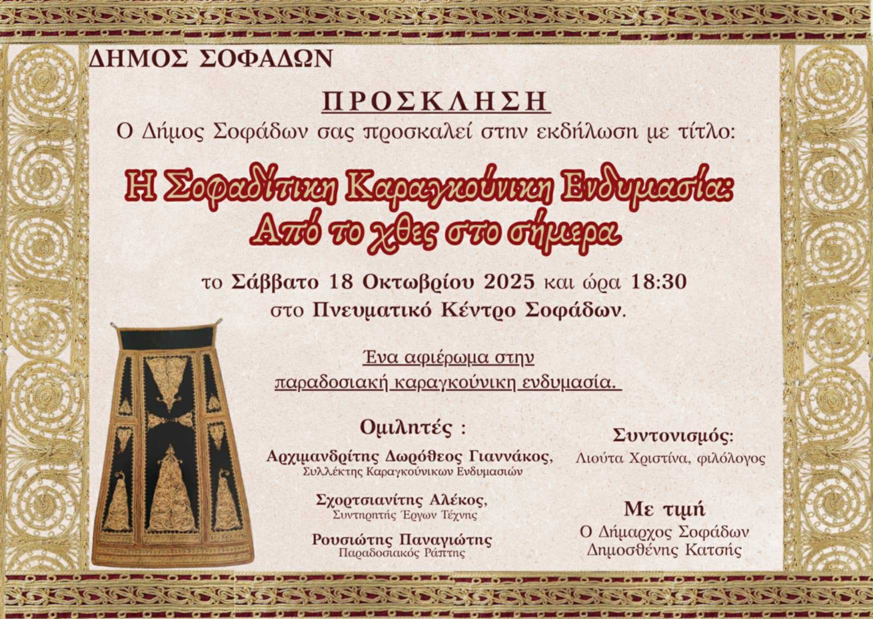 Ο Δήμος Σοφάδων τιμά την τοπική του κληρονομιά μέσα από μια ξεχωριστή πολιτιστική εκδήλωση αφιερωμένη στη Σοφαδίτικη Καραγκούνικη Ενδυμασία, ένα ανεκτίμητο κομμάτι της θεσσαλικής παράδοσης που φέρνει στο προσκήνιο την αισθητική, την ιστορία και τη μνήμη του τόπου.