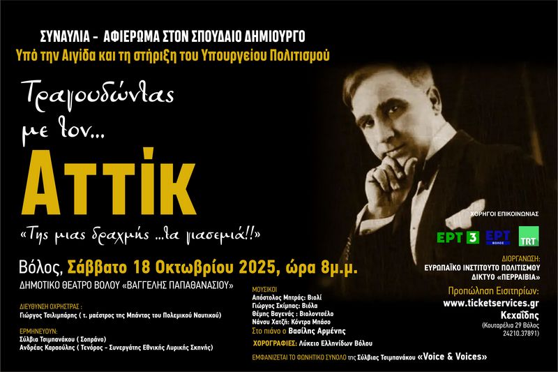 Μια ξεχωριστή μουσική εκδήλωση με τίτλο «Της μιας δραχμής τα γιασεμιά» παρουσιάζει το Δίκτυο «Περραιβία» το Σάββατο στις 8 μ.μ. στο Δημοτικό Θέατρο Βόλου. Πρόκειται για ένα μεγάλο αφιέρωμα στον Αττίκ, ή αλλιώς Κλέωνα Τριανταφύλλου, τον καλλιτέχνη που σφράγισε με το έργο του το ελληνικό ελαφρό τραγούδι.
