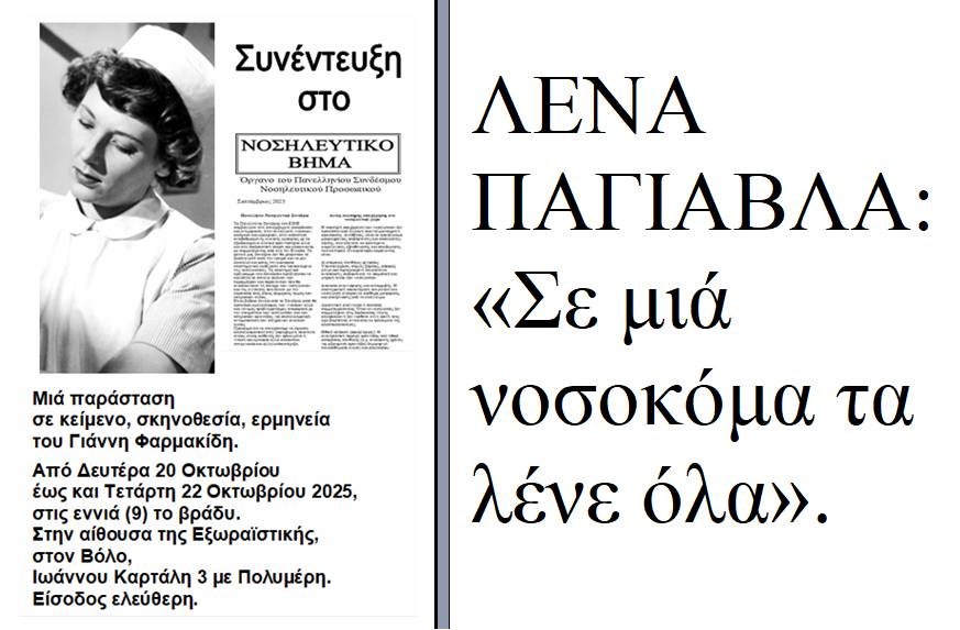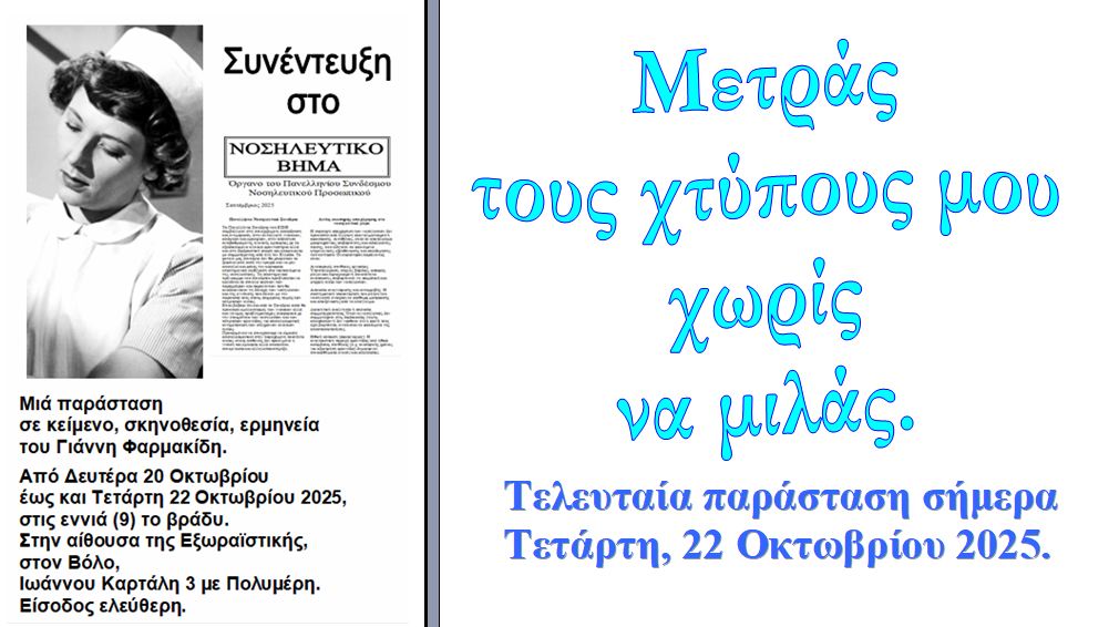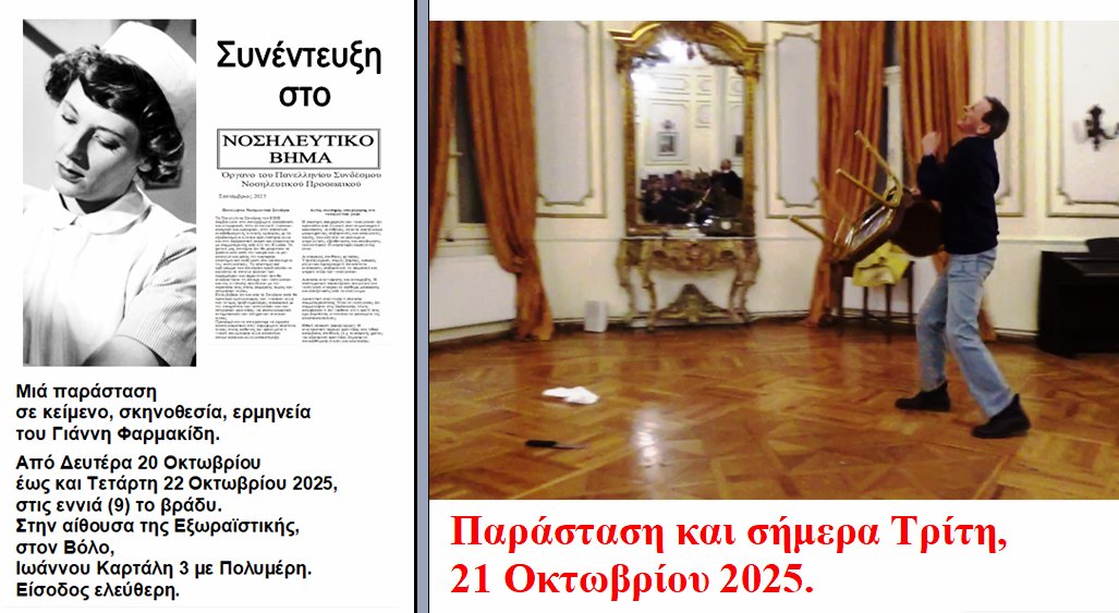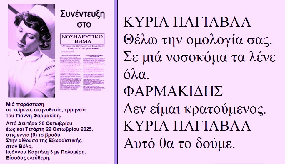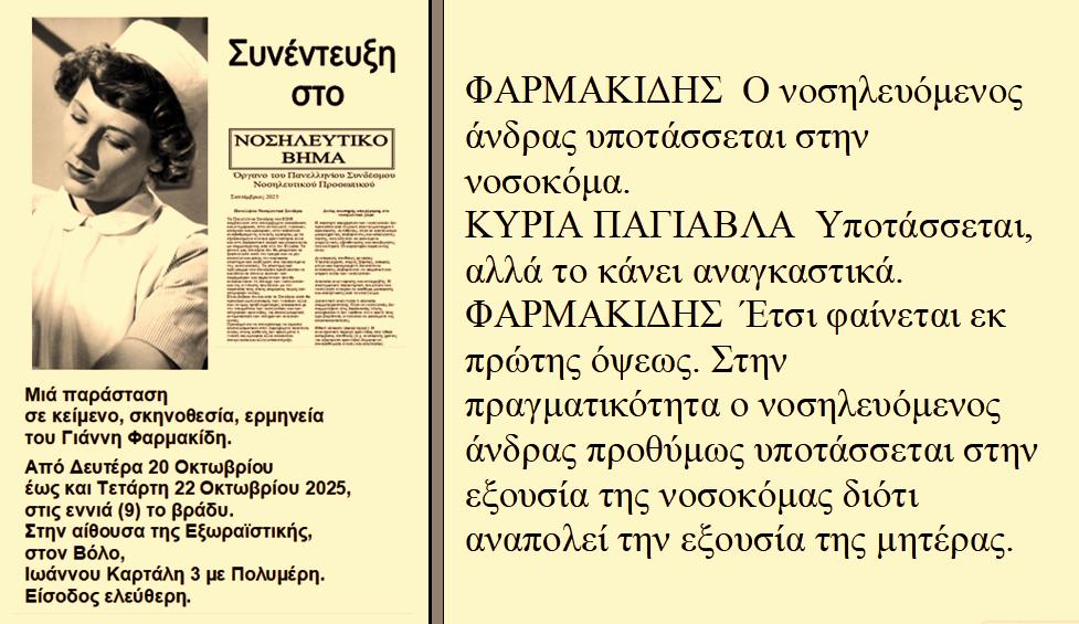 Ο σκηνοθέτης και ηθοποιός Γιάννης Φαρμακίδης παρουσιάζει το νέο του έργο, με τίτλο «Συνέντευξη στο νοσηλευτικό βήμα», μια παράσταση δικής του σκηνοθεσίας και ερμηνείας. Η πλοκή ξετυλίγεται γύρω από έναν συγγραφέα, τον οποίο υποδύεται ο ίδιος ο Φαρμακίδης, και μια συντάκτρια του οργάνου των νοσηλευτών, που του παίρνει συνέντευξη.