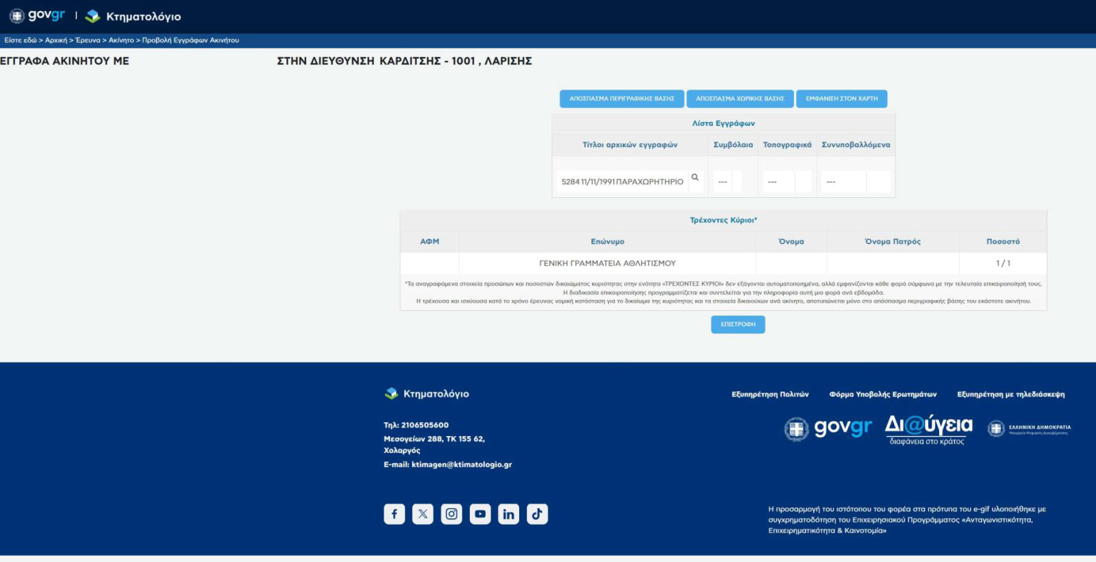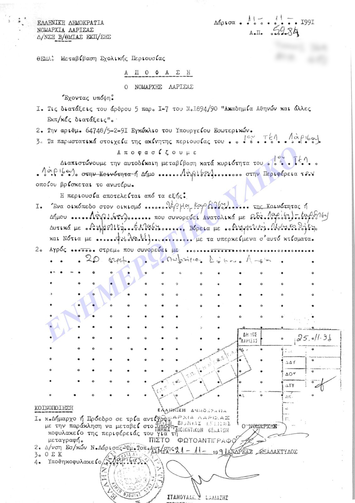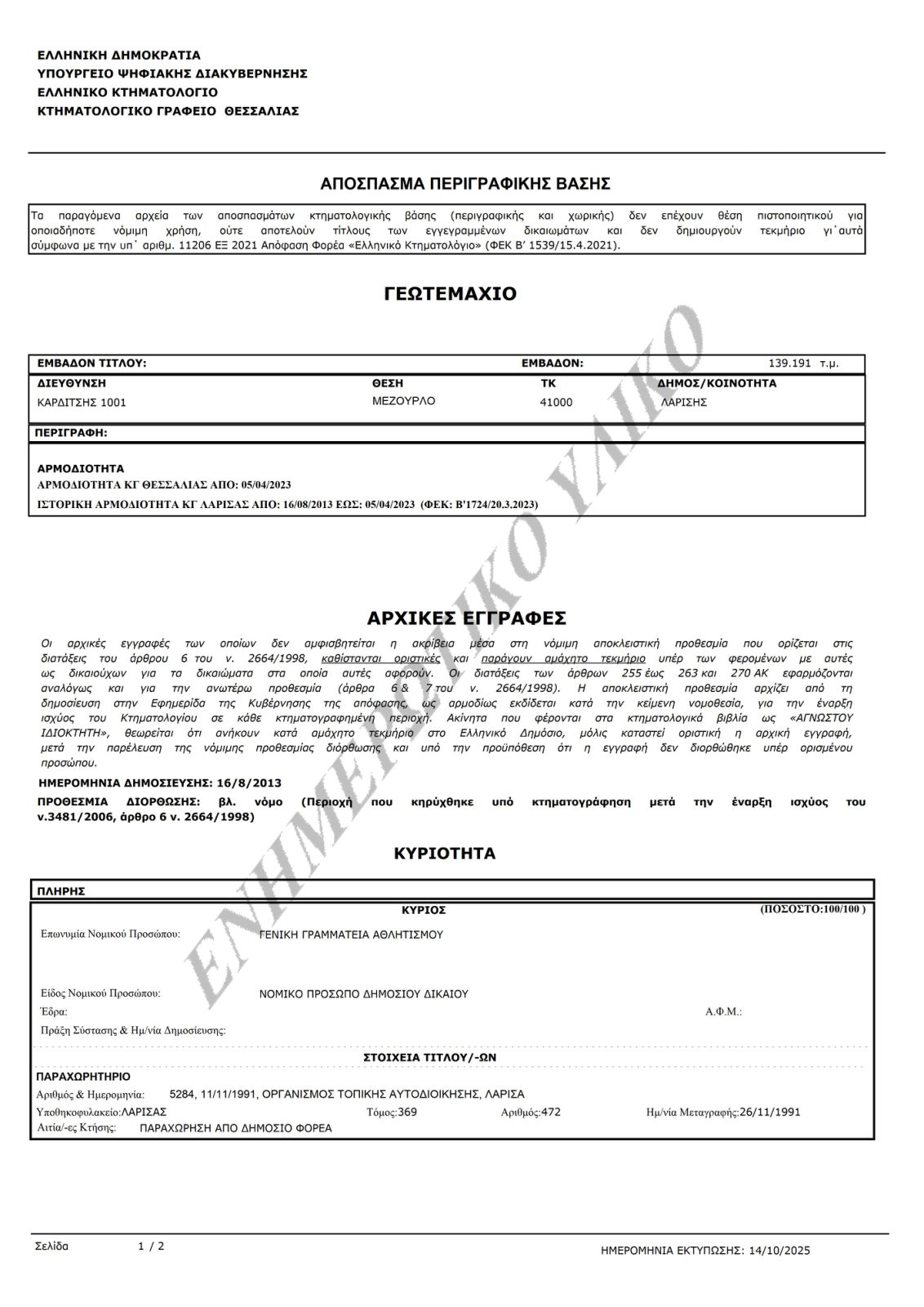 Το Εύρημα: Σύμφωνα με την ηλεκτρονική σελίδα του Κτηματολογίου, ο τίτλος κτήσης που έχει καταχωριστεί για την κυριότητα της Γ.Γ.Α. είναι το υπ’ αριθμόν 5284/11-11-1991 Παραχωρητήριο. Το ίδιο προκύπτει από το απόσπασμα περιγραφικής βάσης που αφορά στο ίδιο ακίνητο που αναφέρεται στο ίδιο παραχωρητήριο. Από μία απλή επισκόπηση του εγγράφου αυτού όμως, το οποίο επισυνάπτεται, διαπιστώνεται ότι δεν αφορά σε παραχώρηση κυριότητας στη ΓΓΑ αλλά αντιθέτως σε παραχώρηση από τη Νομαρχία Λάρισας (Δ/νση Β/θμιας Εκπαίδευσης) προς τον Δήμο Λαρισαίων για σχολική περιουσία (1ο ΤΕΛ) και δεν έχει καμία απολύτως σχέση με την έκταση του γηπέδου ή τη Γ.Γ.Α!!!