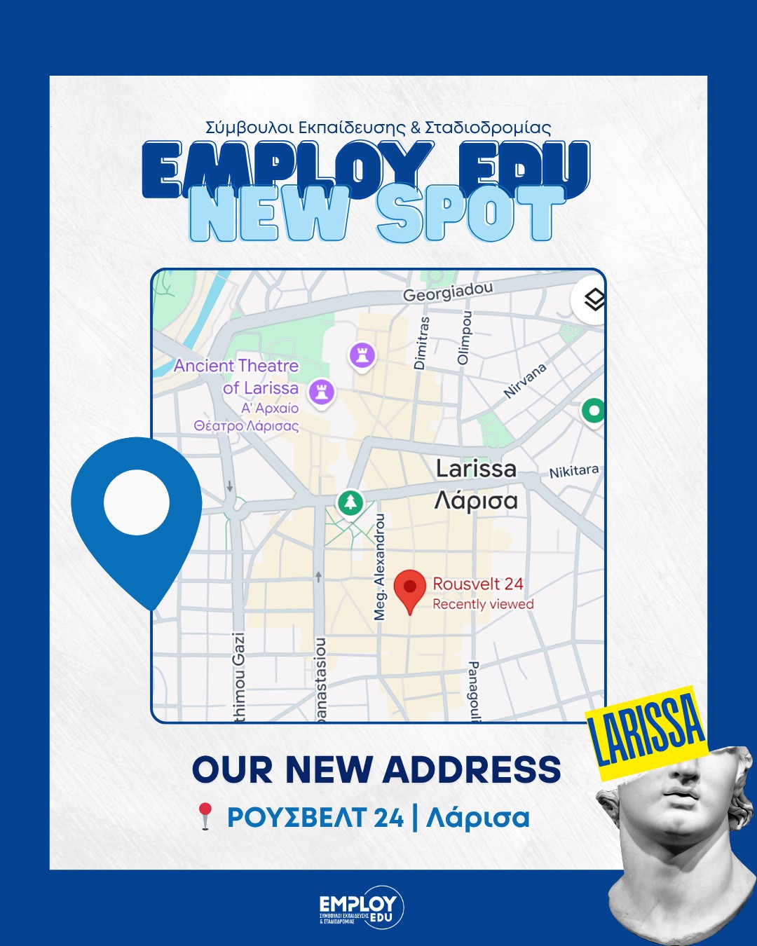 Ανταποκρινόμενη σε αυτή τη μεγάλη ζήτηση , η EMPLOY EDU – Σύμβουλοι Εκπαίδευσης και Σταδιοδρομίας (https://employ.edu.gr/) εγκαινιάζει το νέο της Κέντρο Επαγγελματικού Προσανατολισμού στη Λάρισα, μετά την Αθήνα, τη Θεσσαλονίκη, και τη Λαμία. Τα εγκαίνια θα πραγματοποιηθούν την Παρασκευή 24 Οκτωβρίου στις 20:00, στον πεζόδρομο της οδού Ρούζβελτ 24, στην Πλατεία Ταχυδρομείου.