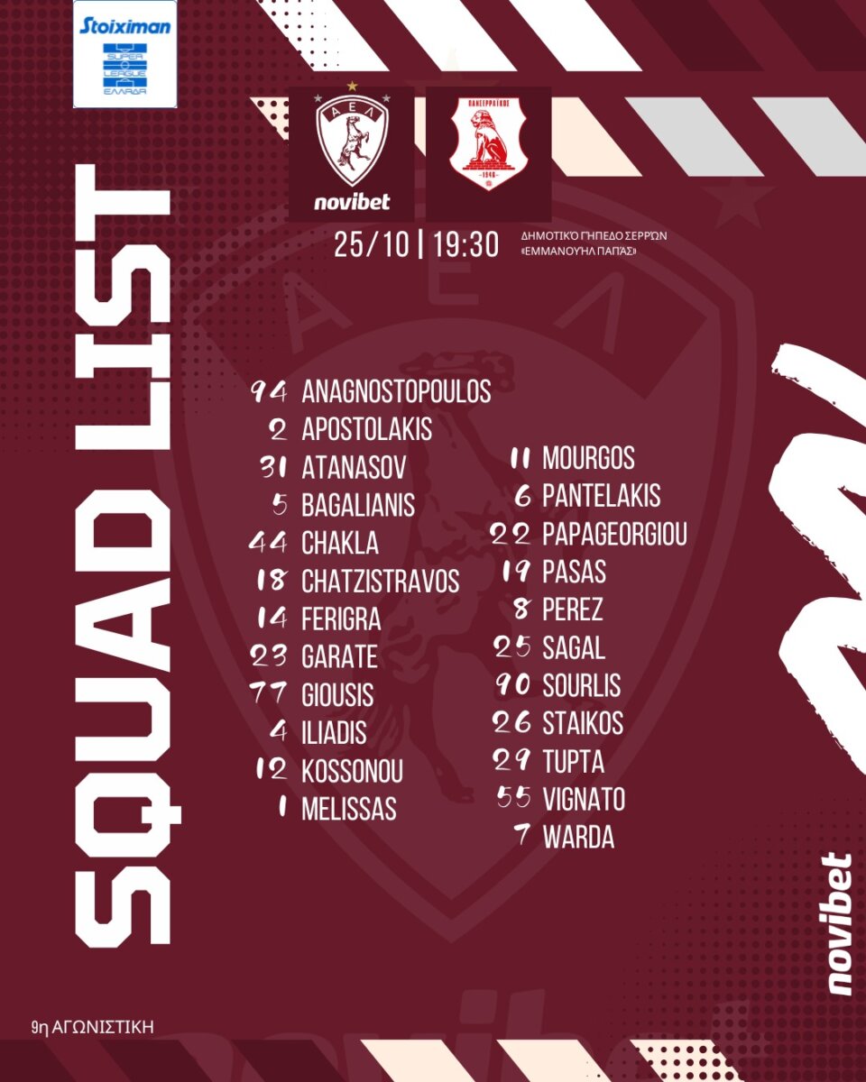 Ολοκληρώθηκε το πρωί της Παρασκευής (24/10) η προετοιμασία της ΑΕΛ Novibet για τον αγώνα Πρωταθλήματος με αντίπαλο τον Πανσερραϊκό στο Δημοτικό Γήπεδο Σερρών «Εμμανουήλ Παπάς» για την 8η Αγωνιστική της Stoiximan Super League (25/10/25, 19:30).