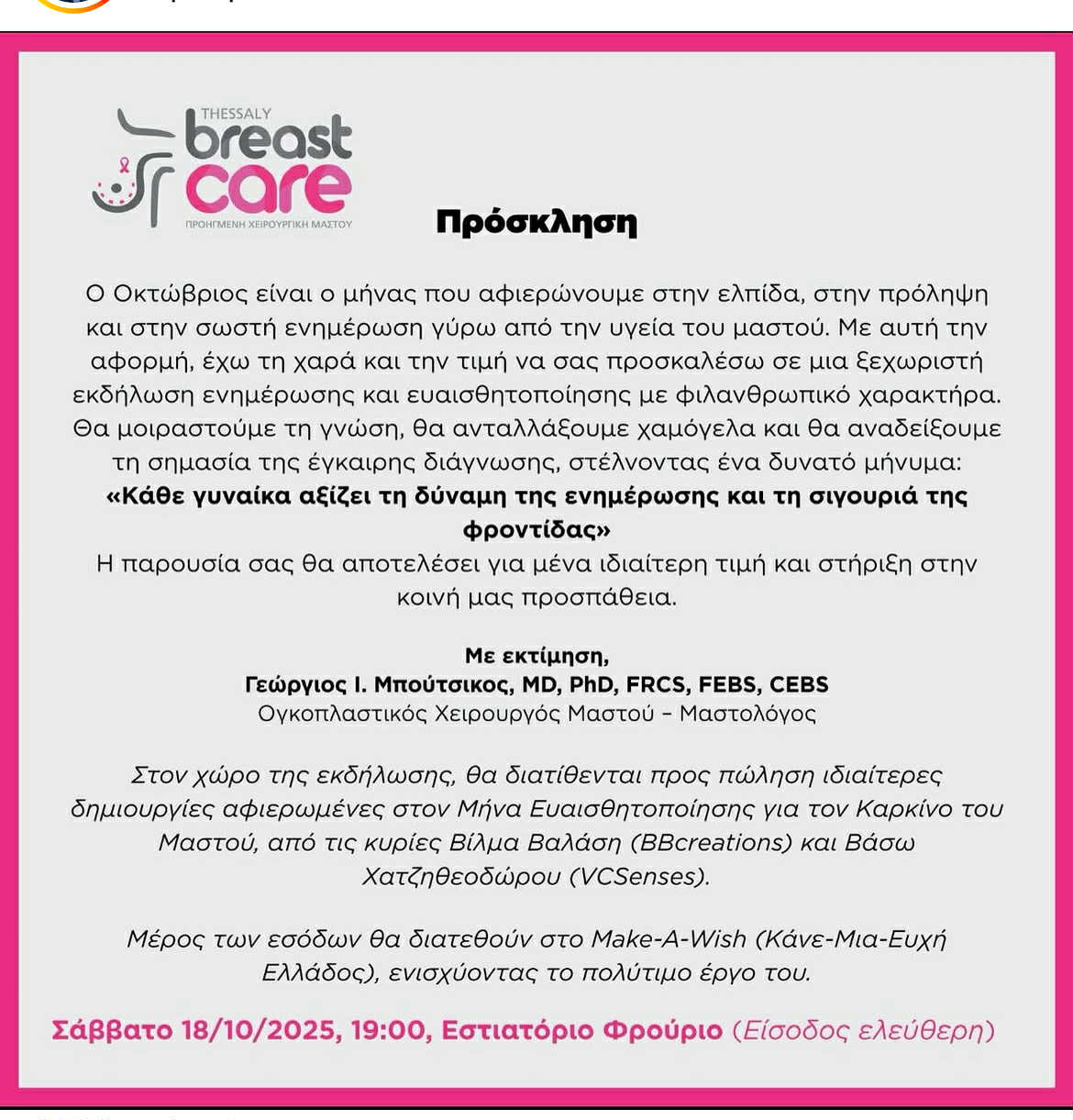 Ο Οκτώβριος είναι ο μήνας αφιερωμένος στην ελπίδα, την πρόληψη και την ενημέρωση γύρω από τον καρκίνο του μαστού. Με αφορμή την εκδήλωση ενημέρωσης – ευαισθητοποίησης με φιλανθρωπικό χαρακτήρα που διοργάνωσε ο ογκοπλαστικός χειρουργός μαστού – μαστολόγος Γιώργος Μπούτσικος στη Λάρισα, ο γιατρός μίλησε στην εκπομπή του FORMEDIA RADIO 99.8 «Ennitime is a good time» και την Έννη Λεβέντη, στέλνοντας ένα ισχυρό μήνυμα: «Κάθε γυναίκα αξίζει τη δύναμη της ενημέρωσης και τη σιγουριά της φροντίδας».