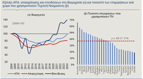 Επιπρόσθετα, το 2024 οι επενδύσεις στην Ελλάδα σε μηχανολογικό και μεταφορικό εξοπλισμό υπολείπονταν κατά περίπου 25% των αντίστοιχων του 2008.