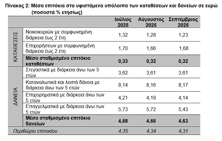 Σύμφωνα με τα στοιχεία της ΤτΕ, τον Σεπτέμβριο του 2025, το μέσο σταθμισμένο επιτόκιο του συνόλου των υφιστάμενων καταθέσεων παρέμεινε αμετάβλητο στο 0,32%, ενώ το αντίστοιχο επιτόκιο των υφιστάμενων δανείων παρέμεινε σχεδόν αμετάβλητο στο 4,63%.