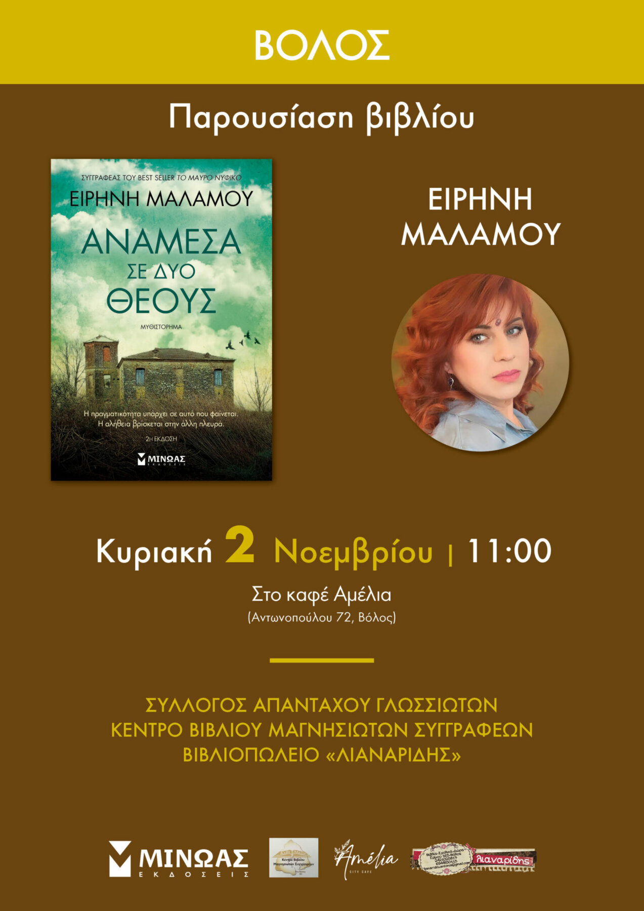 Μετά το best seller της “Το μαύρο νυφικό” (Εκδ. Λιβάνη) η συγγραφέας Ειρήνη Μαλάμου επιστρέφει με το νέο της μυθιστόρημα «Ανάμεσα σε δύο Θεούς» από τις Εκδόσεις Μίνωας, ένα έργο που κινείται ανάμεσα στο παρόν και το παρελθόν, την ιστορία και τη μυθοπλασία, την αλήθεια και τη φαντασία. Μιλώντας στην εκπομπή του FORMEDIA RADIO 99.8 «Ennitime is a good time» με την Έννη Λεβέντη και τον Κώστα Ανέστη, η Ειρήνη Μαλάμου αποκάλυψε τα μυστικά της έμπνευσής της και την αγάπη της για τη Θεσσαλία, τόπο όπου διαδραματίζεται το μεγαλύτερο μέρος της πλοκής.