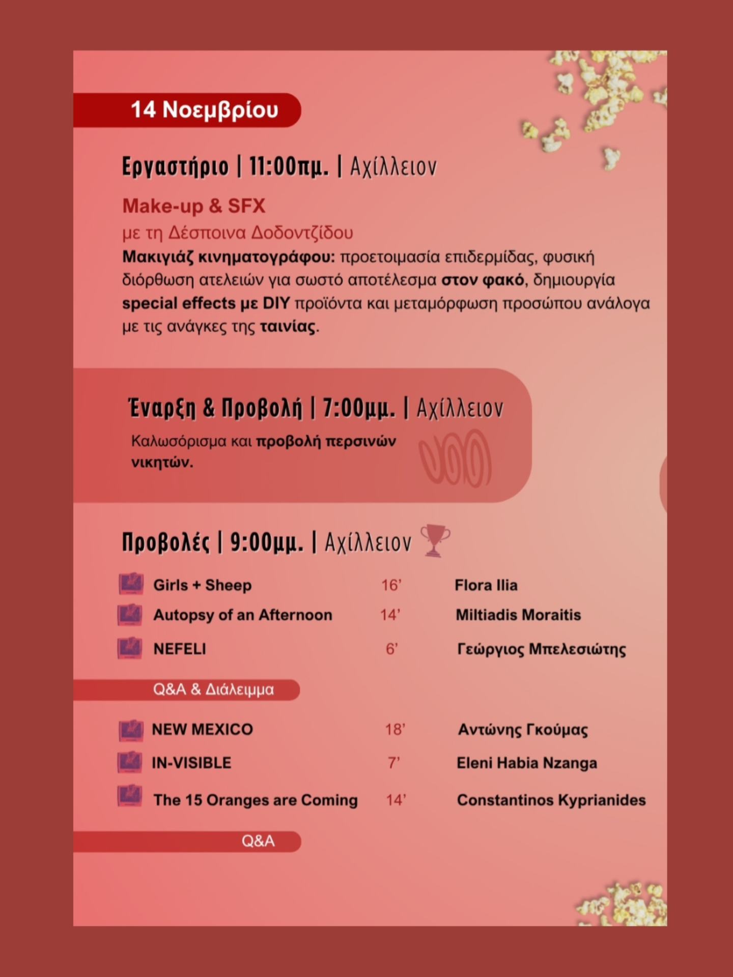 Το διαγωνιστικό πρόγραμμα περιλαμβάνει 18 ταινίες από όλη την Ελλάδα και την Κύπρο, ενώ παράλληλα έχουν προγραμματιστεί τρία εργαστήρια: για make-up και ειδικά εφέ με τη Δέσποινα Δοδοντζίδου, για τα μυστικά πίσω από την ταινία με την Παυλίνα Αγαλιανού και για τον φωτισμό στο σινεμά με τον Μάκη Φράγκο.