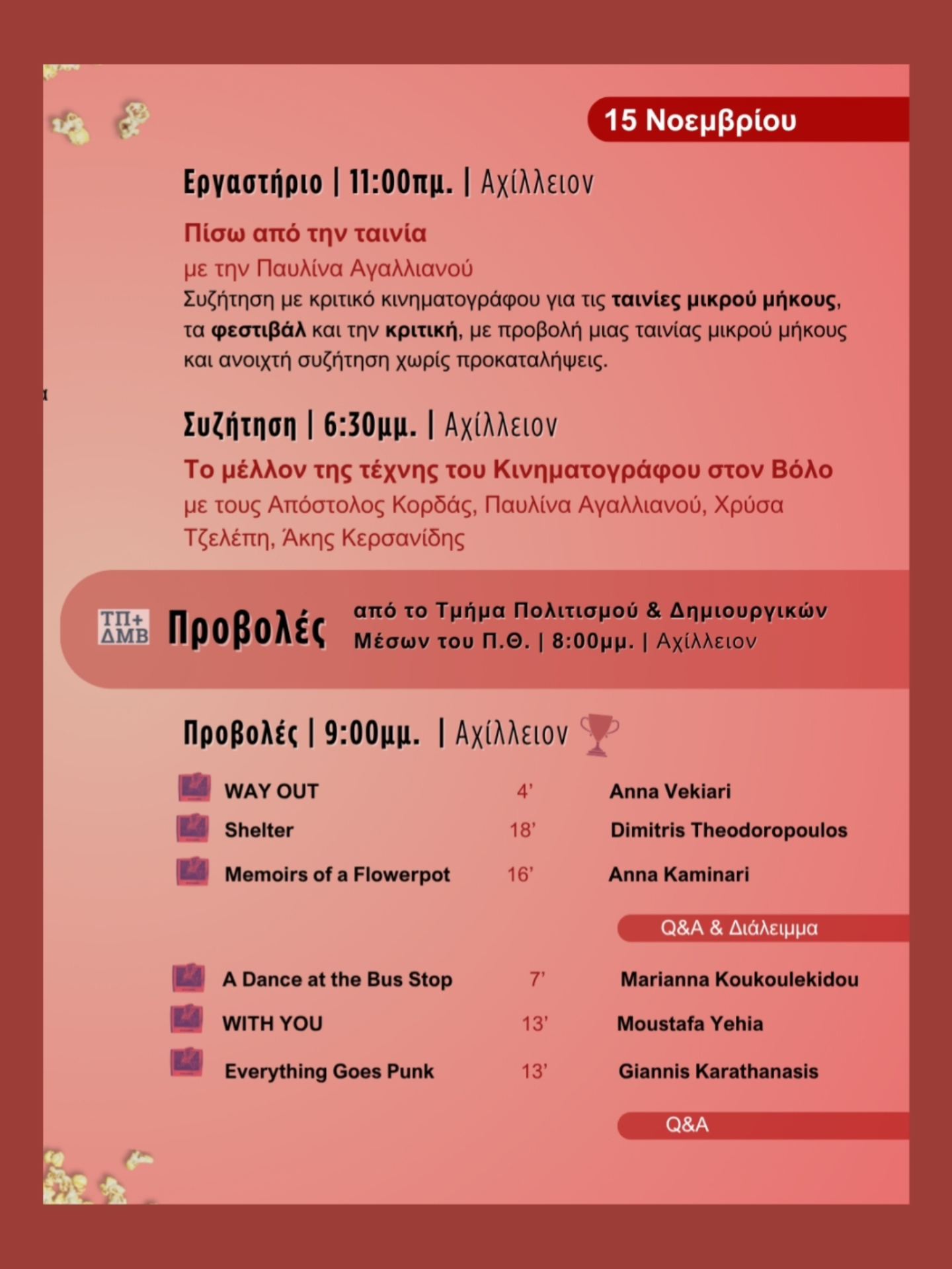 Ιδιαίτερο ενδιαφέρον παρουσιάζουν και οι δύο ανοιχτές συζητήσεις του Σαββατοκύριακου: «Το μέλλον της τέχνης του κινηματογράφου στο Βόλο» και «Πώς μπορεί να γίνει μια ταινία σε μια μικρή κοινότητα».