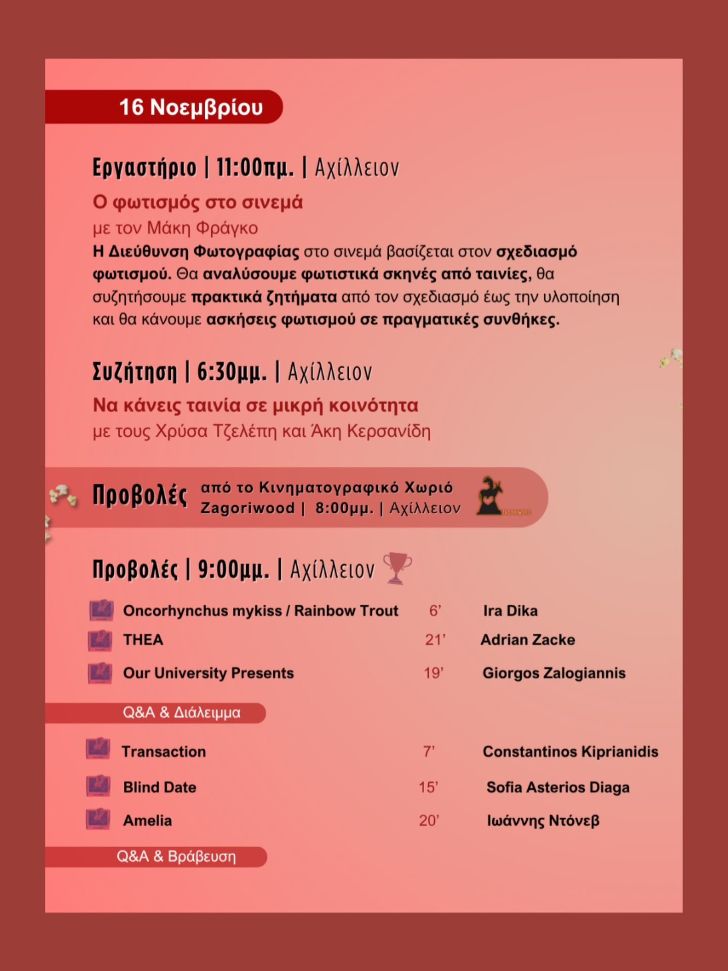 Όλες οι δράσεις, όπως τόνισε ο Φοίβος Ζώτης, είναι δωρεάν για το κοινό. Επιπλέον, δύο τυχεροί συμμετέχοντες από τα εργαστήρια θα έχουν την ευκαιρία να κερδίσουν υποτροφία για το κινηματογραφικό χωριό ZagoriWood, ένα σημαντικό εκπαιδευτικό πρόγραμμα για νέους κινηματογραφιστές.
