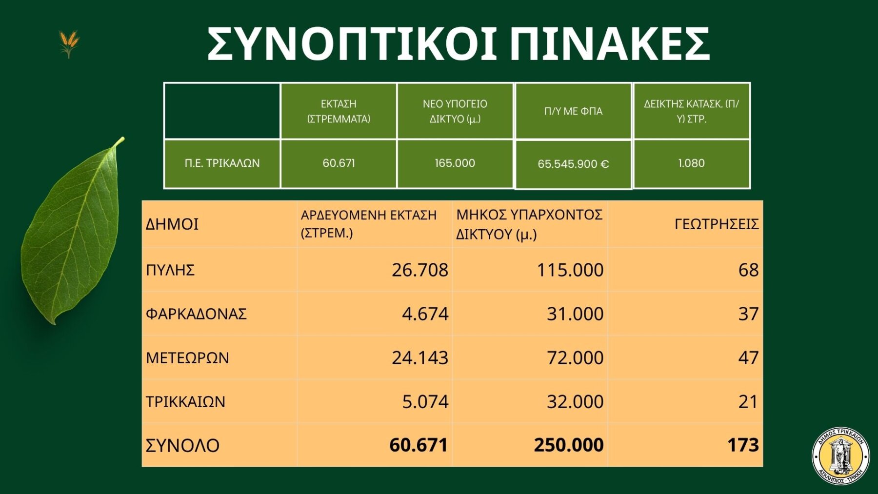 Ένα μεγάλο έργο που αφορά στον εκσυγχρονισμό αρδευτικών υποδομών υπέβαλε προς έγκριση ο Δήμος Τρικκαίων, με στόχο να αποκατασταθούν τα προβλήματα άρδευσης σε όλο τον νομό. Πρόκειται για το έργο «Εκσυγχρονισμός Αρδευτικών Υποδομών Π.Ε. Τρικάλων (ΔΗΜΟΣ ΤΡΙΚΚΑΙΩΝ – ΔΗΜΟΣ ΦΑΡΚΑΔΟΝΑΣ – ΤΟΕΒ ΚΛΟΚΩΤΟΥ – ΔΗΜΟΣ ΠΥΛΗΣ – ΤΟΕΒ ΦΗΚΗΣ – ΤΟΕΒ ΛΥΓΑΡΙΑΣ – ΤΟΕΒ ΠΑΛΑΙΟΜΟΝΑΣΤΗΡΟΥ – ΤΟΕΒ ΓΟΜΦΩΝ –ΤΟΕΒ ΕΛΕΥΘΕΡΟΧΩΡΙΟΥ ΔΗΜΟΣ ΜΕΤΕΩΡΩΝ – ΤΟΕΒ ΒΑΣΙΛΙΚΗΣ – ΤΟΕΒ ΘΕΟΠΕΤΡΑΣ – ΤΟΕΒ ΠΕΡΙΣΤΕΡΑΣ –ΤΟΕΒ ΣΑΡΑΚΙΝΑΣ) με Υπογειοποίηση Αγωγών και Αναβάθμιση Γεωτρήσεων και Αντλιοστασίων».