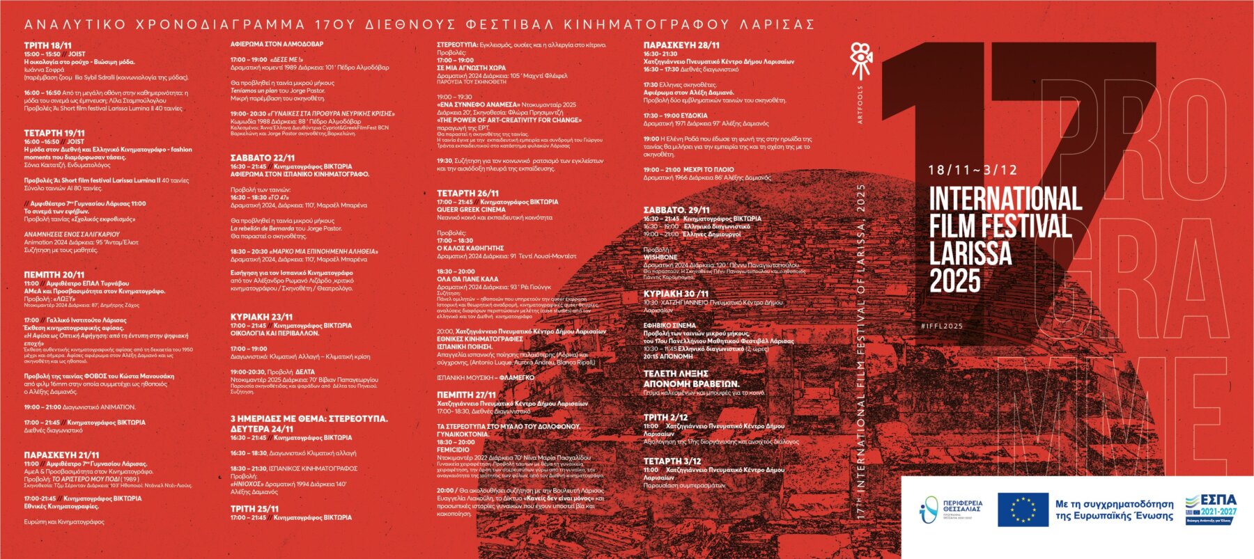 Το 17ο Διεθνές Φεστιβάλ Κινηματογράφου Λάρισας – Artfools επιστρέφει δυναμικά, μετατρέποντας από τις 18 Νοεμβρίου έως τις 3 Δεκεμβρίου την πόλη σε ζωντανό κόμβο κινηματογραφικής δημιουργίας. Με τρία βασικά προγράμματα –μαθητικό, ελληνικό και διεθνές διαγωνιστικό– και πλήθος παράλληλων δράσεων, το φεστιβάλ συνεχίζει να διευρύνει τον ορίζοντά του, προσφέροντας στο κοινό μια από τις πιο πολυσχιδείς διοργανώσεις των τελευταίων ετών.