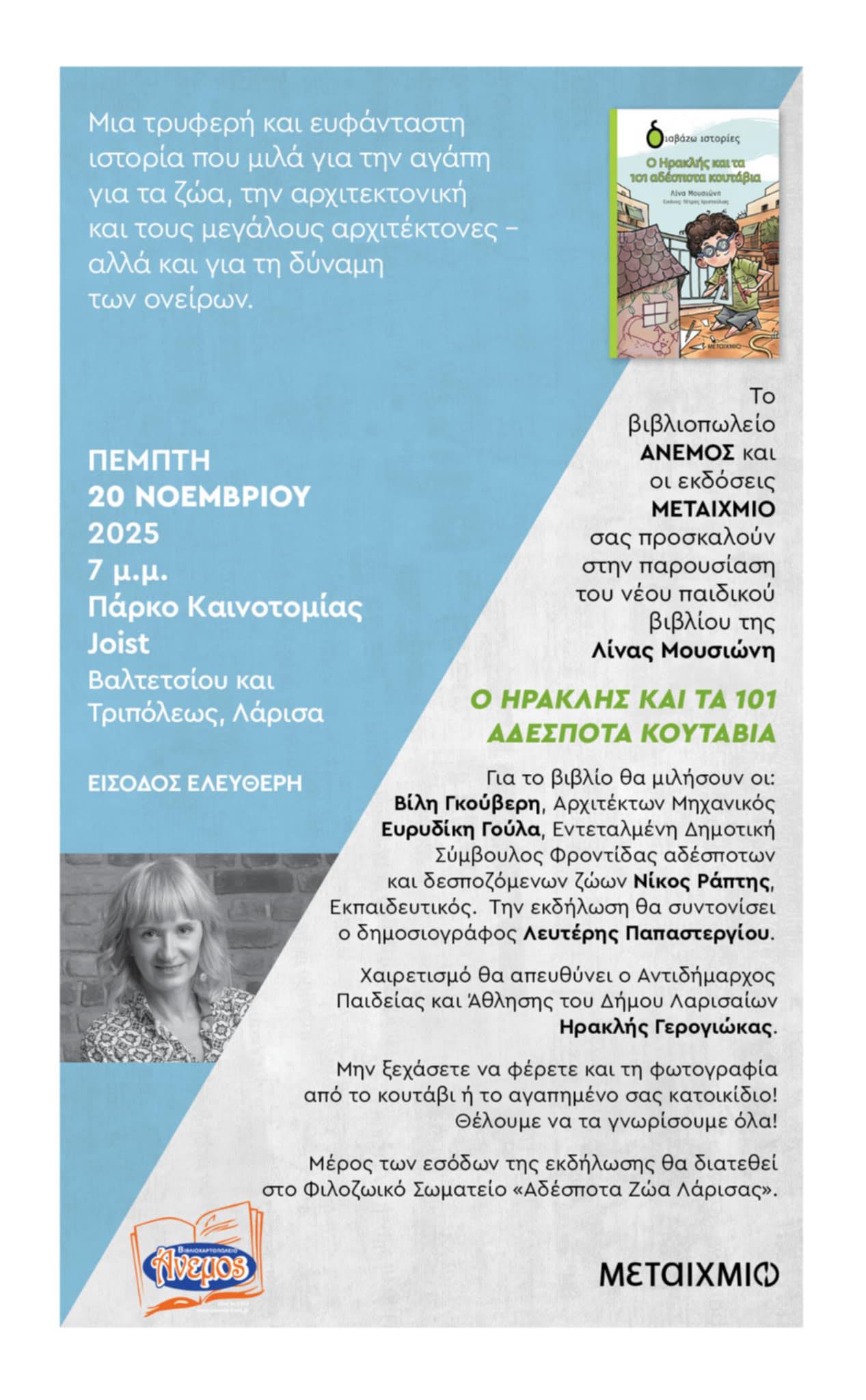 Το νέο παιδικό βιβλίο της Λίνας Μουσιώνη, «Ο Ηρακλής και τα 101 αδέσποτα σκυλιά», παρουσιάζεται την Πέμπτη 20 Νοεμβρίου στο Πάρκο Καινοτομίας JOIST στη Λάρισα, σε μια εκδήλωση που συνδυάζει τη φιλαναγνωσία με την ευαισθητοποίηση γύρω από τα αδέσποτα ζώα. Μιλώντας στην εκπομπή του FORMEDIA RADIO 99.8, «Ennitime is a good time» με την Έννη Λεβέντη και τον Κώστα Ανέστη, η συγγραφέας ανέδειξε τον διπλό χαρακτήρα της ιστορίας: τη δημιουργική φαντασία των παιδιών αλλά και τη σημασία της φροντίδας προς τα αδέσποτα.