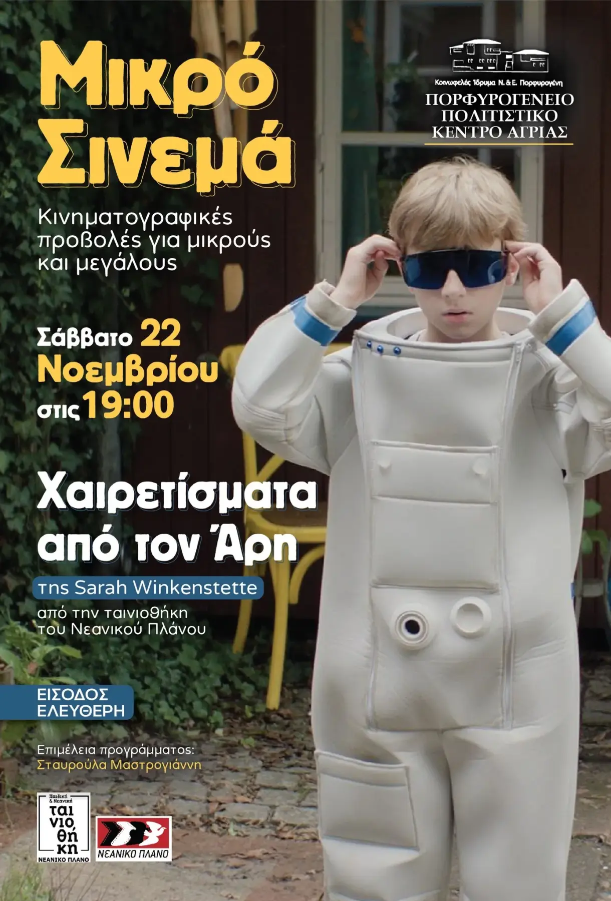 Το «Μικρό Σινεμά» του Πορφυρογένειου Ιδρύματος Αγριάς συνεχίζει τον κύκλο ποιοτικών προβολών του, με σκοπό να φέρει γονείς και παιδιά σε επαφή με τον κινηματογράφο, όπως ανέφερε η παιδαγωγός και υπεύθυνη των Δημιουργικών Εργαστηρίων του Ιδρύματος, Σταυρούλα Μαστρογιάννη, μιλώντας στην εκπομπή του FORMEDIA RADIO 99.8, “Ennitime is a good time” με την Έννη Λεβέντη και τον Κώστα Ανέστη. Αυτό το Σάββατο, 22 Νοεμβρίου, στις 19:00, προβάλλεται η βραβευμένη γερμανική ταινία «Χαιρετίσματα από τον Άρη» (Greetings from Mars) της Sarah Winkenstette, με ελεύθερη είσοδο για όλους.