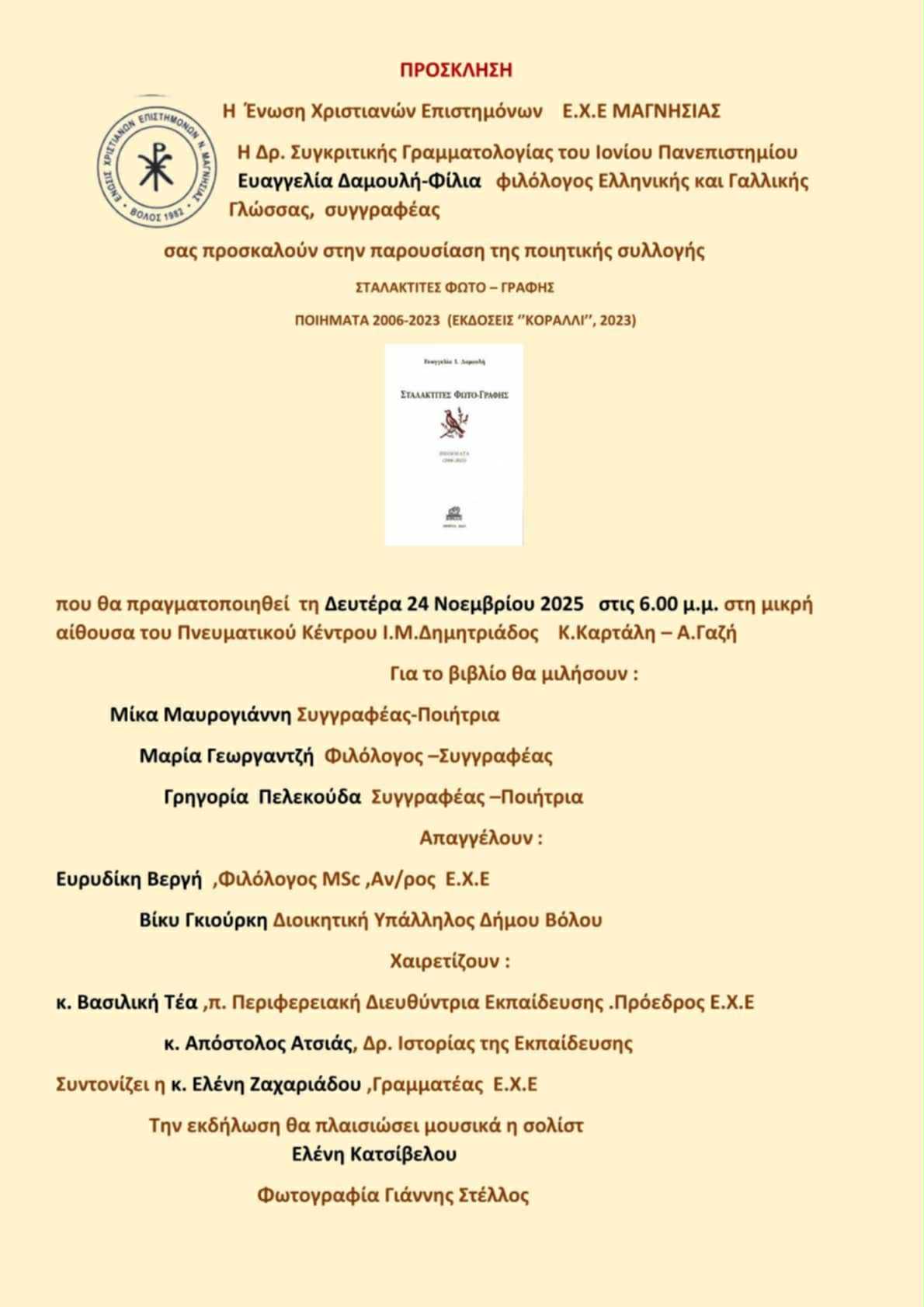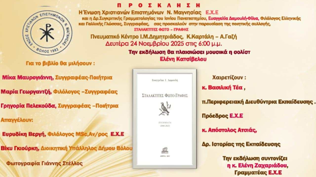 Η πόλη του Βόλου ετοιμάζεται να υποδεχθεί τη συγγραφέα και διδάκτορα Συγκριτικής Γραμματολογίας Ευαγγελία Δαμουλή – Φίλια, η οποία παρουσιάζει τη νέα της ποιητική συλλογή «Σταλακτίτες φωτο-γραφής» τη Δευτέρα 24 Νοεμβρίου, στις 18:00, στη μικρή αίθουσα του Πνευματικού Κέντρου της Ι.Μ. Δημητριάδος Η εκδήλωση τελεί υπό την αιγίδα της Ένωσης Χριστιανών Επιστημόνων Μαγνησίας και πλαισιώνεται από λόγο, μουσική και απαγγελίες.