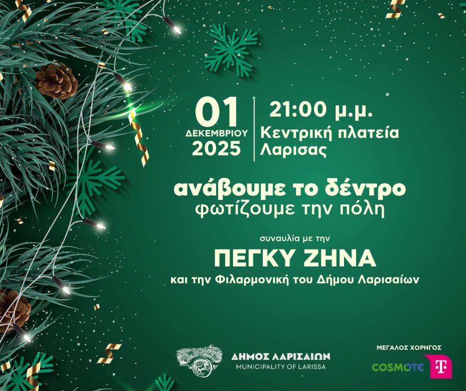 Με το άναμμα του δέντρου ξεκινά μια περίοδος γεμάτη γιορτινές δράσεις, μουσικές, εκπλήξεις για μικρούς και μεγάλους και πολλή… Λάρισα! Ελάτε να ζήσουμε μαζί την πιο φωτεινή στιγμή του χειμώνα και να δώσουμε όλοι το σύνθημα για έναν μαγικό Δεκέμβριο.