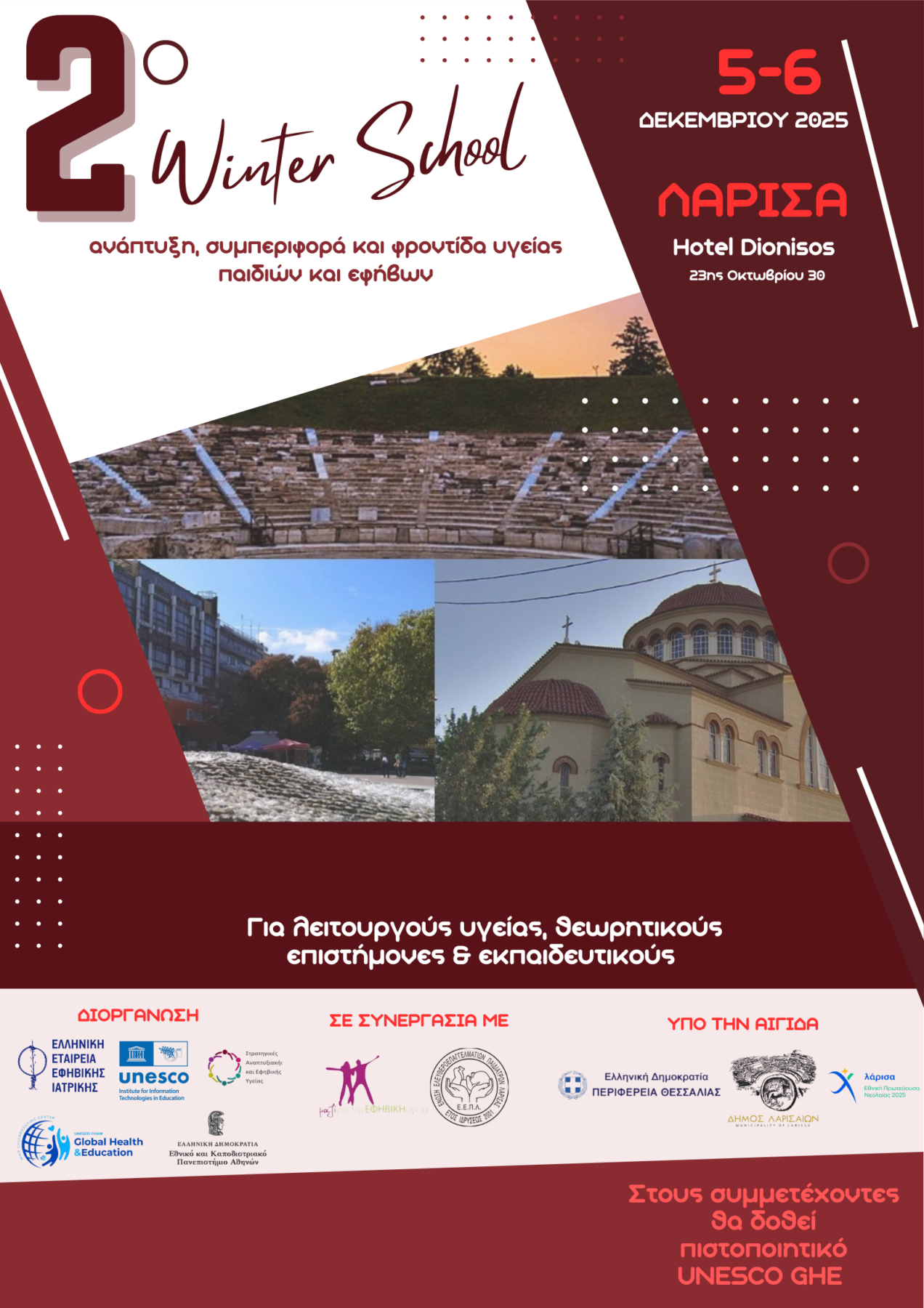Το 2ο Winter School της Ελληνικής Εταιρείας Εφηβικής Ιατρικής πραγματοποιείται στις 5-6 Δεκεμβρίου στη Λάρισα, συγκεντρώνοντας επιστήμονες, λειτουργούς υγείας και εκπαιδευτικούς από όλη τη χώρα, με στόχο την ανάδειξη σύγχρονων προκλήσεων που αφορούν παιδιά, εφήβους και τις οικογένειές τους. Η διοργάνωση φέρει τη συνεργασία της UNESCO Global Health, της Περιφέρειας Θεσσαλίας, του Δήμου Λαρισαίων και πλήθους επιστημονικών και εκπαιδευτικών φορέων, δημιουργώντας ένα χώρο ανταλλαγής γνώσεων και καλών πρακτικών.