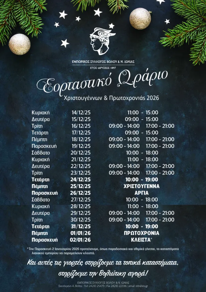 Ο Βόλος έχει μπει για τα καλά στο εορταστικό κλίμα, με στολισμένη αγορά, εντυπωσιακές βιτρίνες και πλήρως οργανωμένο εορταστικό ωράριο. Όπως επισημαίνει ο πρόεδρος του Εμπορικού Συλλόγου Βόλου, Απόστολος Οντόπουλος, στην εκπομπή “Ennitime is a good time” του FORMEDIA RADIO με την Έννη Λεβέντη, «ήδη κινούμαστε σε εορταστικούς ρυθμούς… η πόλη έχει στολισθεί, είμαστε έτοιμοι για να εξυπηρετήσουμε το καταναλωτικό κοινό». Τα καταστήματα ξεκινούν τη λειτουργία τους την Κυριακή 14/12 με προτεινόμενο ωράριο 11:00–15:30, ενώ από τις 20 του μήνα θα λειτουργούν με διευρυμένο πρόγραμμα, τόσο για τους κατοίκους όσο και για τους χιλιάδες τουρίστες που αναμένονται στη γιορτινή πόλη.