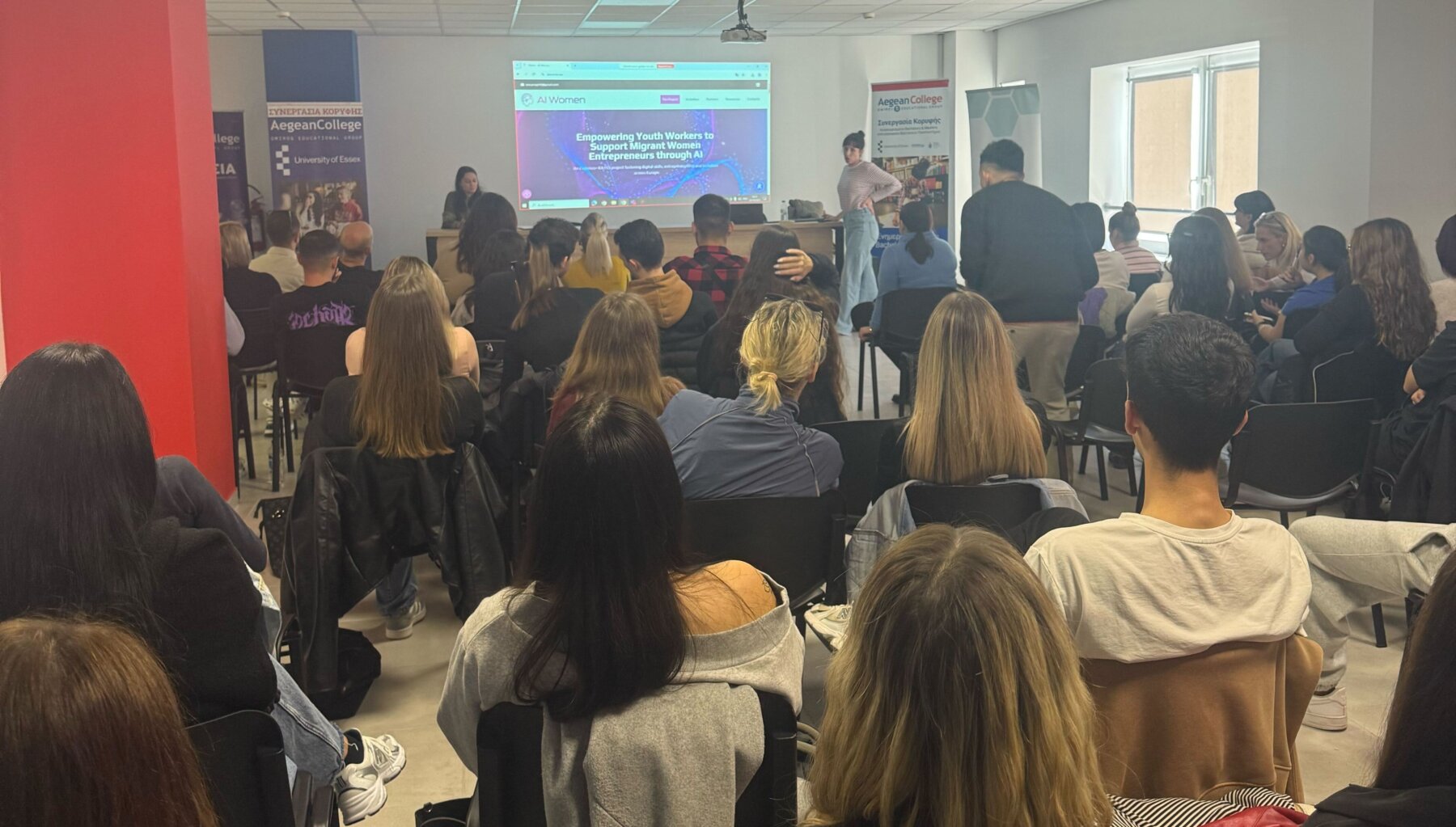 Παράλληλα, στο ίδιο πλαίσιο, παρουσιάστηκε το έργο AI WOMEN, μια ευρωπαϊκή πρωτοβουλία που στοχεύει στην ενδυνάμωση youth workers ώστε να υποστηρίζουν μετανάστριες γυναίκες επιχειρηματίες μέσω εργαλείων Τεχνητής Νοημοσύνης. Οι φοιτητές συμμετείχαν ενεργά σε συζήτηση για την ψηφιακή ένταξη και την κοινωνική επιχειρηματικότητα.