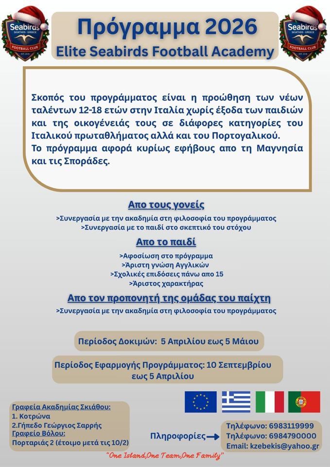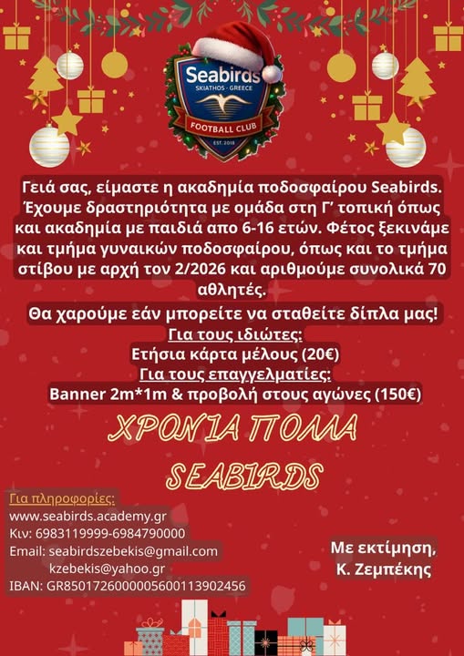 Απολογιστικά, το 2025 ήταν πολύ καλή αλλά απαιτητική χρονιά για τα SEABIRDS, παρά τις δυσκολίες. Σύμφωνα με τον Κώστα Ζεμπέκη, «θεωρούμε ότι έχουν γίνει σημαντικά βήματα μέσα σε αυτό το χρόνο», τόσο σε επίπεδο αγωνιστικό όσο και σε επίπεδο αποδοχής από τη Σκιάθο και τον Βόλο. Η ομάδα καταγράφει καλή πορεία στο πρωτάθλημα, ενώ νεαροί ποδοσφαιριστές έχουν ήδη βρεθεί για δοκιμές σε Πορτογαλία και Ιταλία.