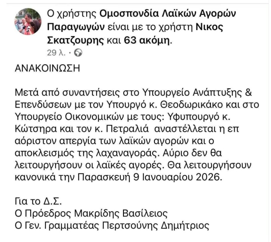 Την εν λόγω απόφαση μοιράστηκε η Ομοσπονδία Λαϊκών Αγορών με ανάρτησή της στα μέσα κοινωνικής δικτύωσης.