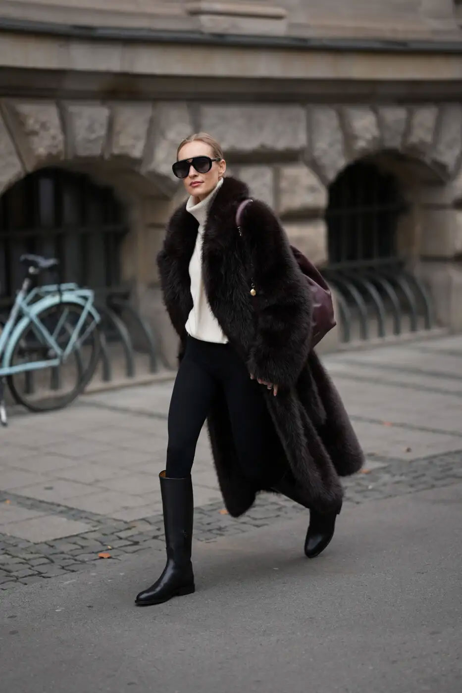 Συνδύασέ το με μια fluffy γούνα και μια τσάντα σε έντονο χρώμα, όπως berry, για ένα polished αποτέλεσμα που ισορροπεί άνεση και chic αισθητική.