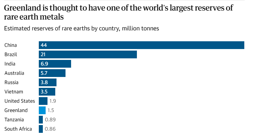 Η Γροιλανδία είναι επίσης σημαντική στον παγκόσμιο αγώνα για τα κρίσιμα ορυκτά. Το νησί κατατάσσεται όγδοο στον κόσμο σε αποθέματα σπάνιων γαιών, τα οποία εκτιμώνται σε 1,5 εκατομμύρια τόνους από την Γεωλογική Υπηρεσία των ΗΠΑ.