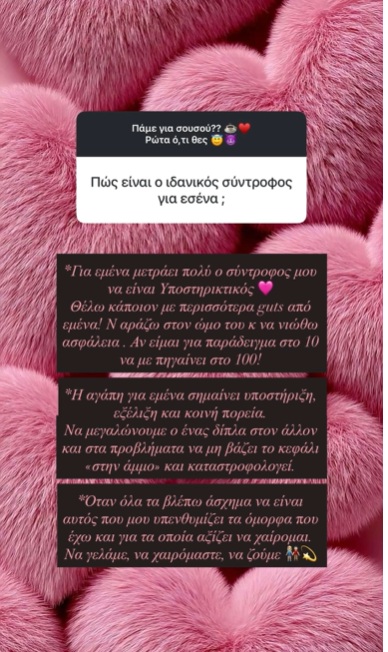 Όσον αφορά στα χαρακτηριστικά που ψάχνει σε έναν σύντροφο, η γνωστή Αλεξάνδρα Παναγιώταρου σημείωσε: «Για εμένα μετρά πολύ ο σύντροφός μου να είναι υποστηρικτικός. Θέλω κάποιον με περισσότερα guts από εμένα! Να αράζω στον ώμο του και να νιώθω ασφάλεια. Αν είμαι για παράδειγμα στο 10 να με πηγαίνει στο 100. Η αγάπη για εμένα σημαίνει υποστήριξη, εξέλιξη και κοινή πορεία. Να μεγαλώνουμε ο ένας δίπλα στον άλλον και στα προβλήματα να μη βάζει το κεφάλι στην άμμο και να καταστροφολογεί. Όταν όλα τα βλέπω άσχημα να είναι αυτός που μου υπενθυμίζει τα όμορφα που έχω και για τα οποία αξίζει να χαίρομαι. Να γελάμε, να χαιρόμαστε, να ζούμε.