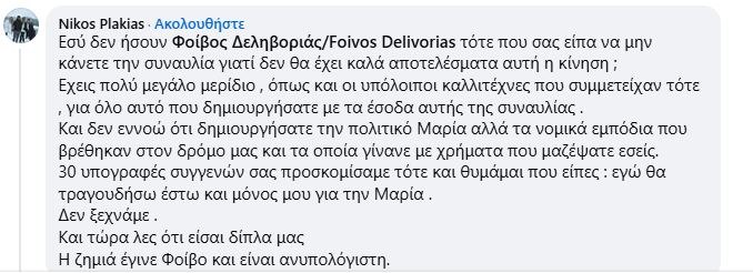 Συγκεκριμένα, στην απάντησή του ο κ. Πλακιάς αναφέρει αρχικά: «Εσύ δεν ήσουν, Φοίβο Δεληβοριάς τότε που σας είπα να μην κάνετε την συναυλία γιατί δεν θα έχει καλά αποτελέσματα αυτή η κίνηση ;»