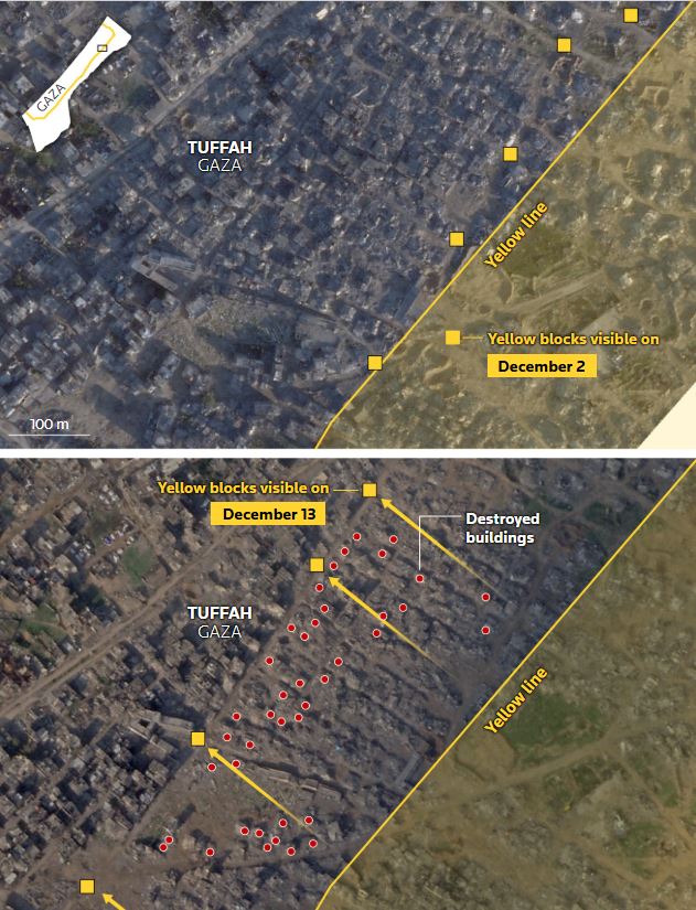 Ωστόσο, δορυφορικές εικόνες από την Αλ Τούφα που τραβήχτηκαν στις 2 και 13 Δεκεμβρίου δείχνουν ότι το Ισραήλ αρχικά τοποθέτησε μπλοκ στην πλευρά της Κίτρινης Γραμμής που ελέγχεται από τη Χαμάς και στη συνέχεια τα μετακίνησε περίπου 200 μέτρα πιο μέσα.