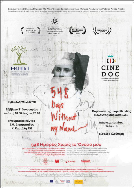 Στο επίκεντρο βρίσκεται το VR ντοκιμαντέρ «548 μέρες χωρίς το όνομά μου», παραγωγής του Εβραϊκού Μουσείου Θεσσαλονίκης, βασισμένο στο ομώνυμο αυτοβιογραφικό βιβλίο της Ροζίνα Ασσέρ-Πάρδο. Μέσα από τη ματιά ενός δεκάχρονου παιδιού, το έργο αφηγείται την εμπειρία μιας μικρής Εβραίας στη Θεσσαλονίκη της Κατοχής, που έζησε κρυμμένη με ψεύτικο όνομα για 548 ημέρες, βιώνοντας τον φόβο, την αγωνία και την απώλεια ταυτότητας.
