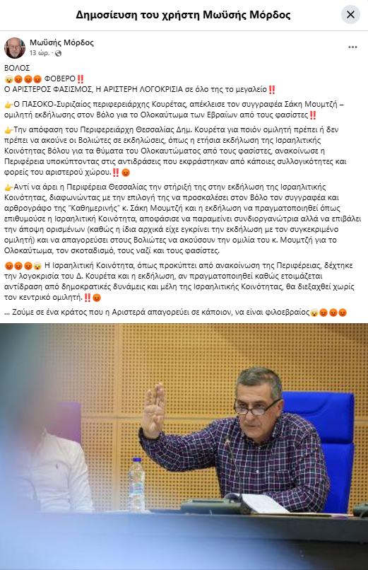 Η ανάρτηση του Μωυσή Μόρδου δεν είναι μια οργισμένη πολιτική κραυγή· είναι μια κραυγή αγωνίας. Αγωνίας για το πού οδηγείται μια κοινωνία όταν επιτρέπει σε πολιτικές αρχές να αποφασίζουν ποιος δικαιούται να είναι «αρκετά αποδεκτός» για να μιλήσει υπέρ των Εβραίων. Όταν, όπως εύστοχα σημειώνεται, «ζούμε σε ένα κράτος που η Αριστερά απαγορεύει σε κάποιον να είναι φιλοεβραίος».