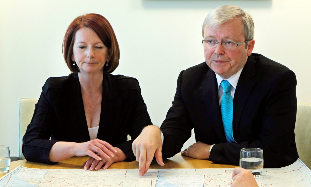 Φωτογραφία αρχείου που δείχνει την πρωθυπουργό της Αυστραλίας Τζούλια Γκίλαρντ (αριστερά) να συναντά τον υπουργό Εξωτερικών της Αυστραλίας Κέβιν Ραντ στα γραφεία της Κοινοπολιτείας στο Waterfront House, Μπρίσμπεϊν, Αυστραλία, 7 Αυγούστου 2010.