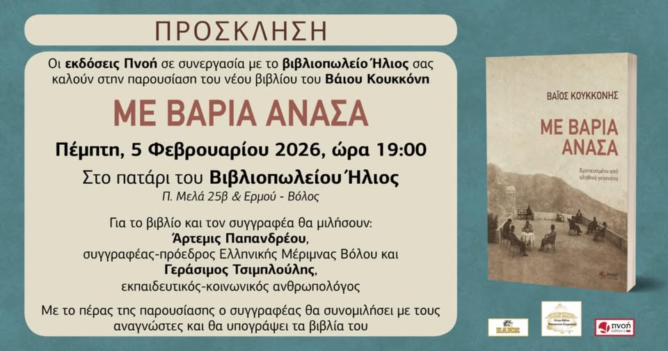 Η παρουσίαση του βιβλίου θα πραγματοποιηθεί την Πέμπτη 5 Φεβρουαρίου 2026, στις 19:00, στο πατάρι του βιβλιοπωλείου «ΗΛΙΟΣ» στον Βόλο (Π. Μελά 25β & Ερμού). Για το έργο θα μιλήσουν η συγγραφέας Άρτεμις Παπανδρέου και ο εκπαιδευτικός-κοινωνικός ανθρωπολόγος Γεράσιμος Τσιμπλούλης. Περισσότερες πληροφορίες για το έργο του συγγραφέα μπορείτε να βρείτε στην προσωπική του ιστοσελίδα vaioskoukkonis.gr.