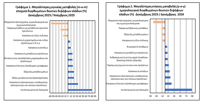 Ο δείκτης του κλάδου λοιπών ορυχείων και λατομείων, σημείωσε τη μεγαλύτερη ποσοστιαία αύξηση ενώ ο δείκτης του κλάδου κατασκευής μηχανοκίνητων οχημάτων, ρυμουλκούμενων και ημιρυμουλκούμενων οχημάτων, σημείωσε τη μεγαλύτερη ποσοστιαία μείωση, κατά τον Δεκέμβριο 2025 σε σχέση με τον Νοέμβριο 2025.