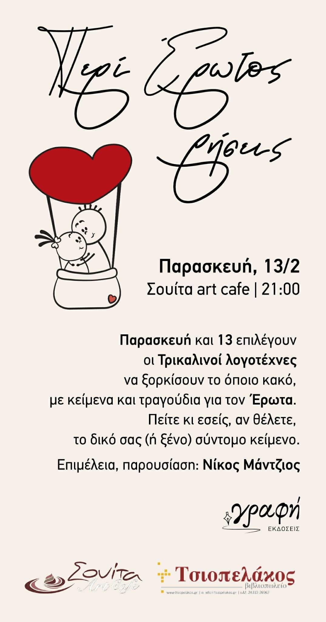 Όλα αυτά θα συμβούν την Παρασκευή 13 Φεβρουαρίου, ώρα 21:00 στο Suite Art Cafe στα Τρίκαλα με ελεύθερη είσοδο για το κοινό.