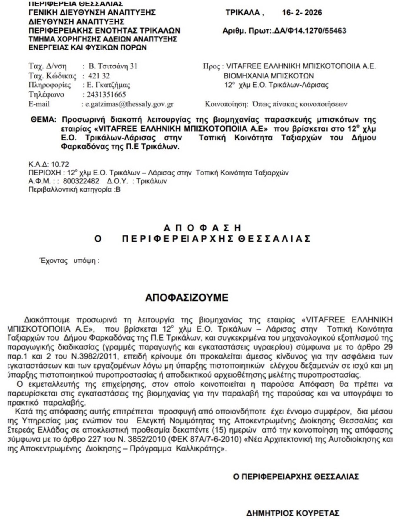 Πανικόβλητη πλέον η περιφέρεια Θεσσαλίας προχωρά σε ανάκληση αδειών και στο δεύτερο εργοστάσιο της επιχείρησης στη Λάρισα, καθώς φέρεται να είχε τα ίδια προβλήματα με εκέινο που διαδραματίστηκε το δυστύχημα στα Τρίκαλα!